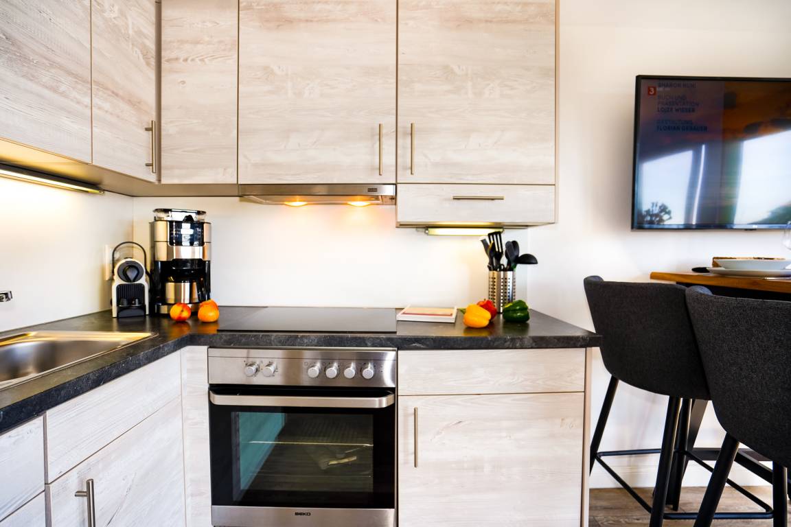 Die stilvolle und offene Küche ist mit allen erforderlichen Geräten wie Backofen, Cerankochfeld, Spülmaschine, Kühlschrank mit Gefrierfach und diversen Elektrokleingeräten ausgestattet. Ihre Mahlzeiten nehmen Sie am angrenzenden Hochtisch ein.