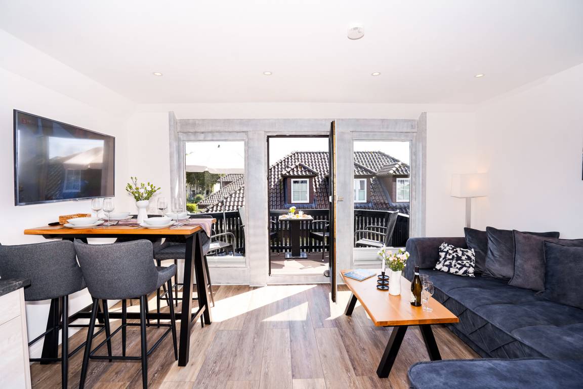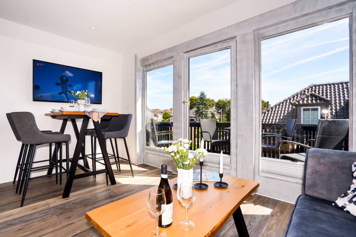 Die im Dachgeschoss liegende Ferienwohnung überzeugt durch ihre harmonische Ausstattung. Das lichtdurchflutete Wohnzimmer ist mit einer großzügigen und bequemen Eckcouch ausgestattet. Als Entertainment stehen Ihnen ein Flatscreen-TV und natürlich kostenloses WLAN zur Verfügung.