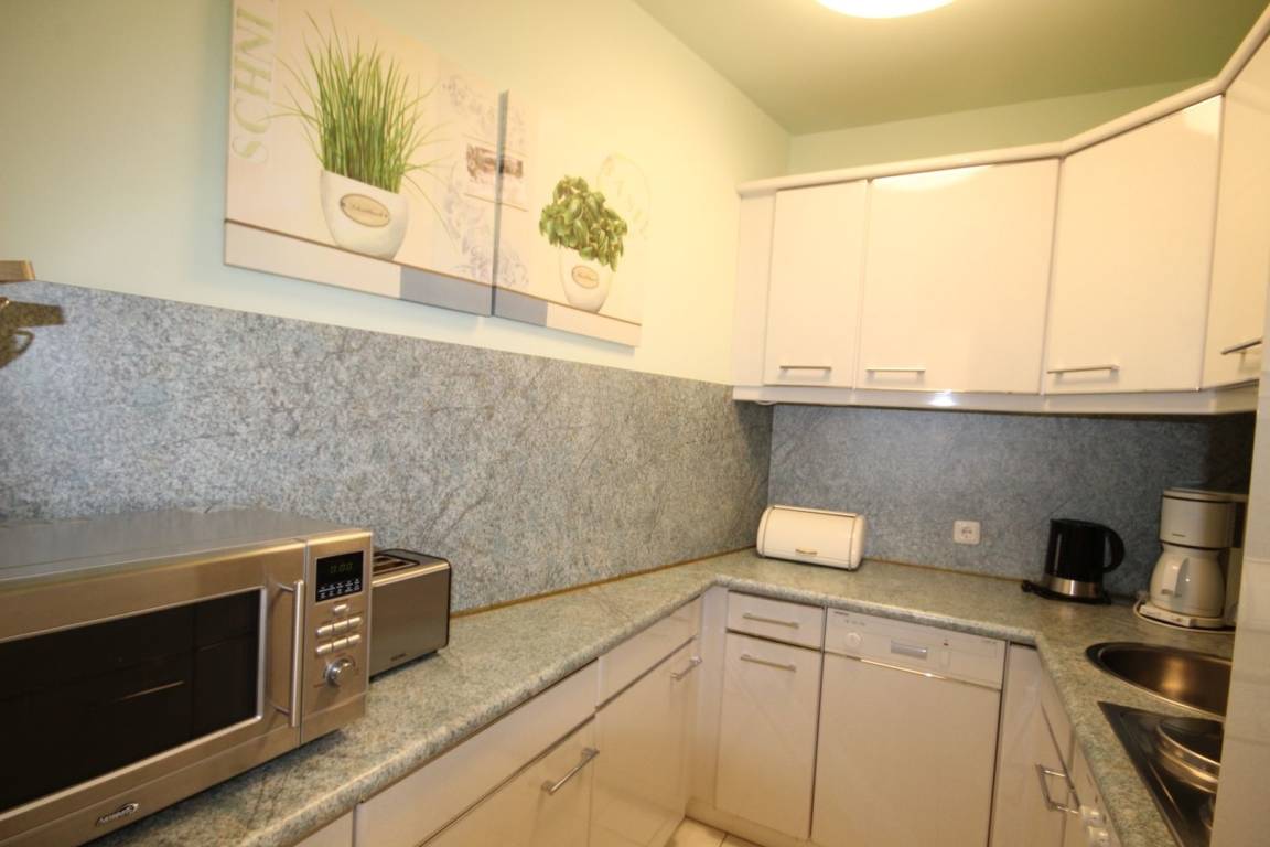 Die kleine Küche ist mit 4-Platten-Herd, Geschirrspüler, Kühlschrank, Mikrowelle und allen wichtigen Küchengeräten bestens ausgestattet.