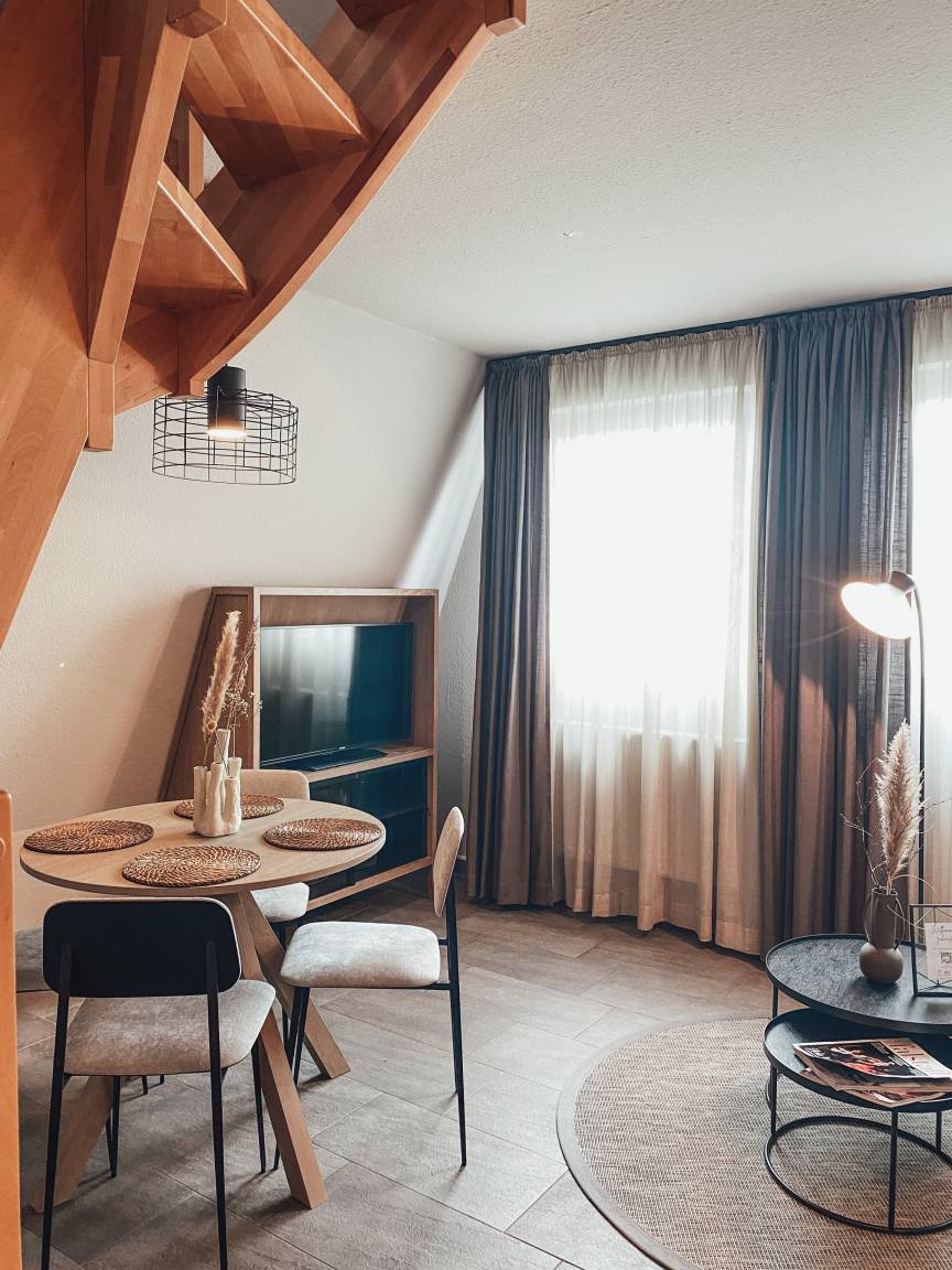 Unsere 3 Appartements im Obergeschoss sind ruhig gelegen, direkt neben dem Restaurant in unseren vier Nurdachhäusern und über eine Außentreppe zu erreichen. Die Ferienwohnungen mit ihren 55qm verteilt auf 2 Etagen bietet Platz für bis zu 4 Personen. Von hier aus haben Sie außerdem einen direkten Zugang zum Dreiländersee. Unsere Ferienwohnungen sind ausgestattet mit einem kleinen Bad mit Dusche, einem getrennten Wohnbereich mit voll ausgestatteter Küchenzeile, ein Schlafzimmer mit Doppelbett und 2 zusätzlichen Einzelbetten in der 2. Etage.