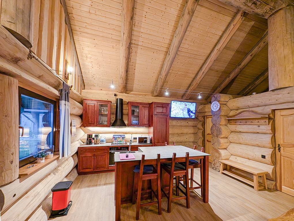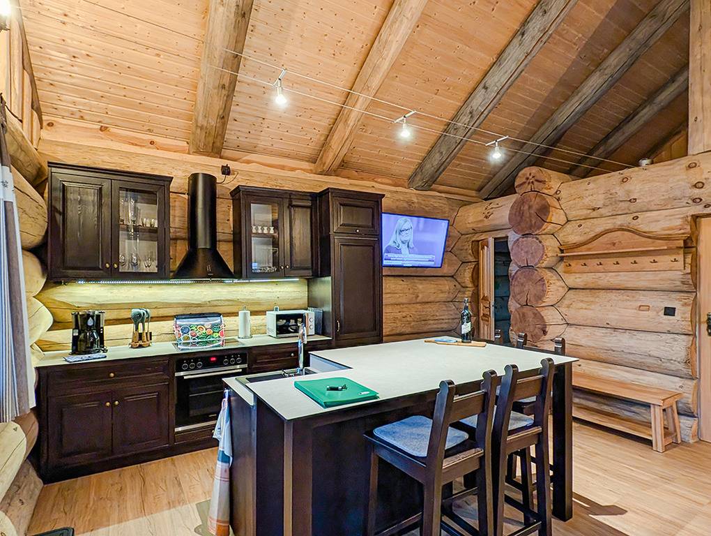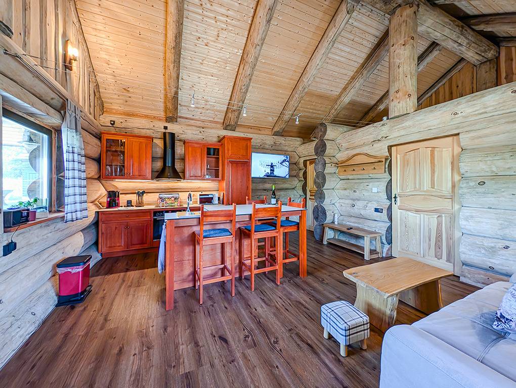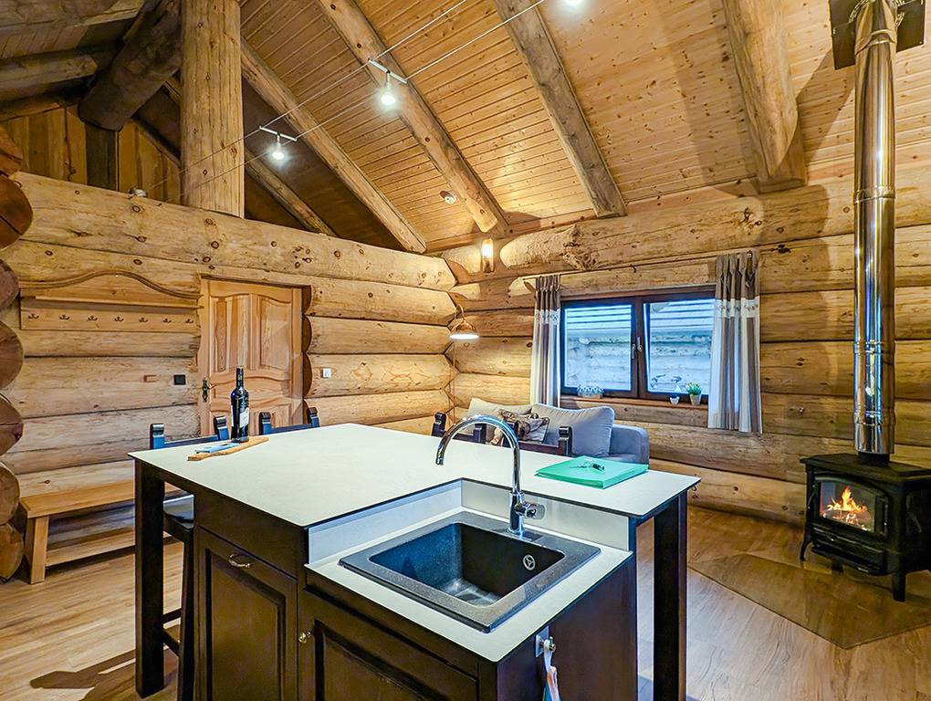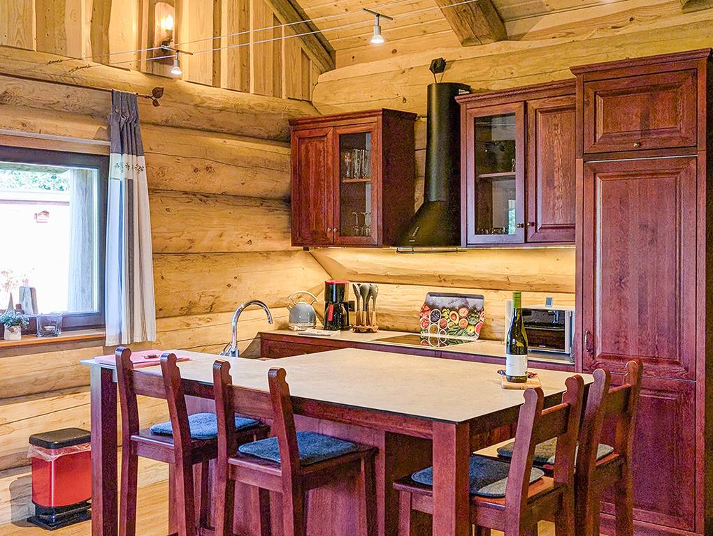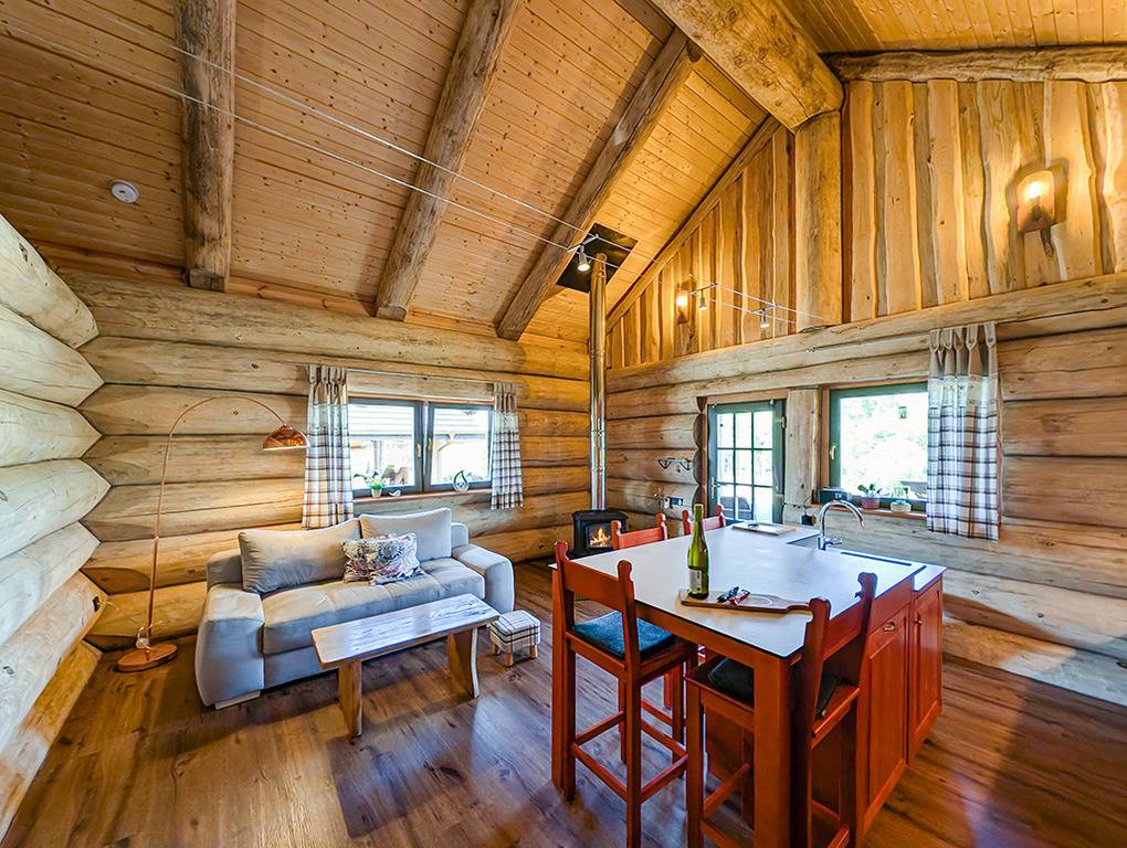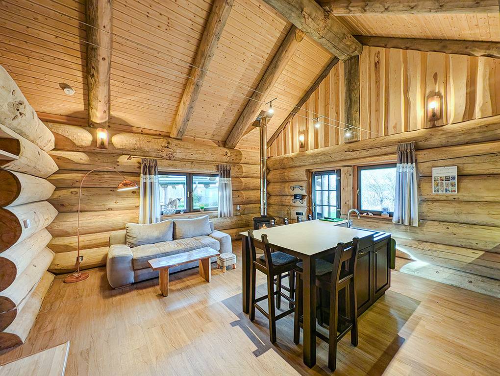Haus: Sehr schöne Ferienhäuser mit Kaminofen und Sauna. Kleine Ferienhaussiedlung mit sieben Naturstammhäusern im kanadischen Blockhausstil. Jedes Haus mit rustikal-gemütlichem Ambiente. Geschmackvolle Einrichtung, moderne Komfortausstattung. Glasfaser-Internetzugang über W-Lan. Waschmaschine. Zentral-/Fußbodenheizung. Nichtraucherhaus. Große überdachte Terrasse mit Sitzmöbeln, Feuerschale, Cortenstahl-Grill. Garten mit Rasenfläche, Ruheliegen. Eigenes Saunahaus mit Panoramafenster. 2 Pkw-Stellplätze am Haus.
