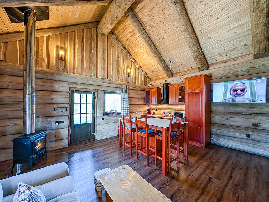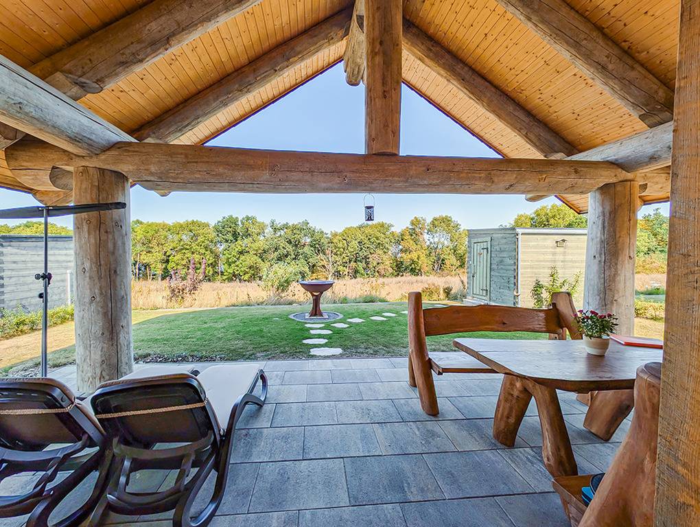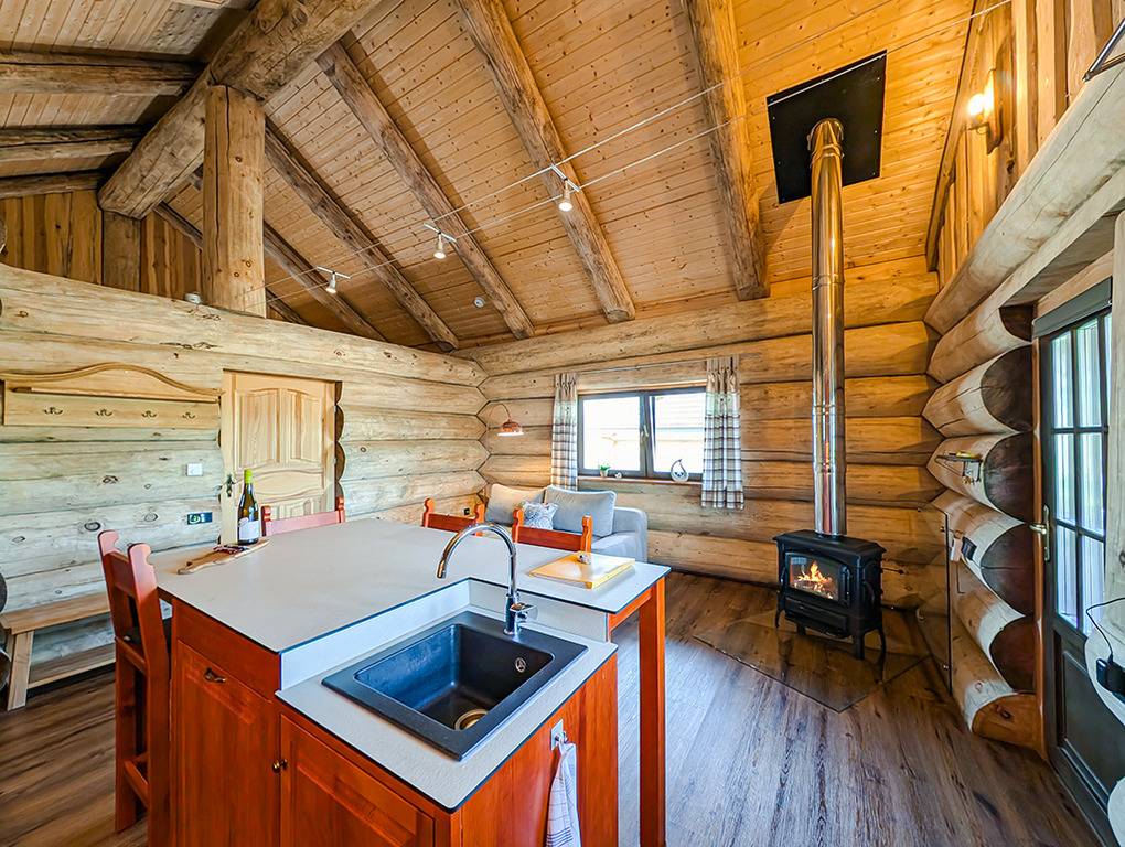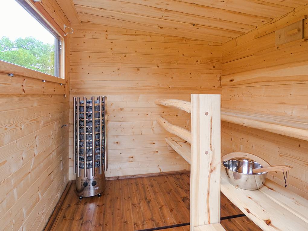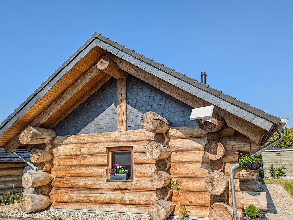 Haus: Sehr schöne Ferienhäuser mit Kaminofen und Sauna. Kleine Ferienhaussiedlung mit sieben Naturstammhäusern im kanadischen Blockhausstil. Jedes Haus mit rustikal-gemütlichem Ambiente. Geschmackvolle Einrichtung, moderne Komfortausstattung. Glasfaser-Internetzugang über W-Lan. Waschmaschine. Zentral-/Fußbodenheizung. Nichtraucherhaus. Große überdachte Terrasse mit Sitzmöbeln, Feuerschale, Cortenstahl-Grill. Garten mit Rasenfläche, Ruheliegen. Eigenes Saunahaus mit Panoramafenster. 2 Pkw-Stellplätze am Haus.
