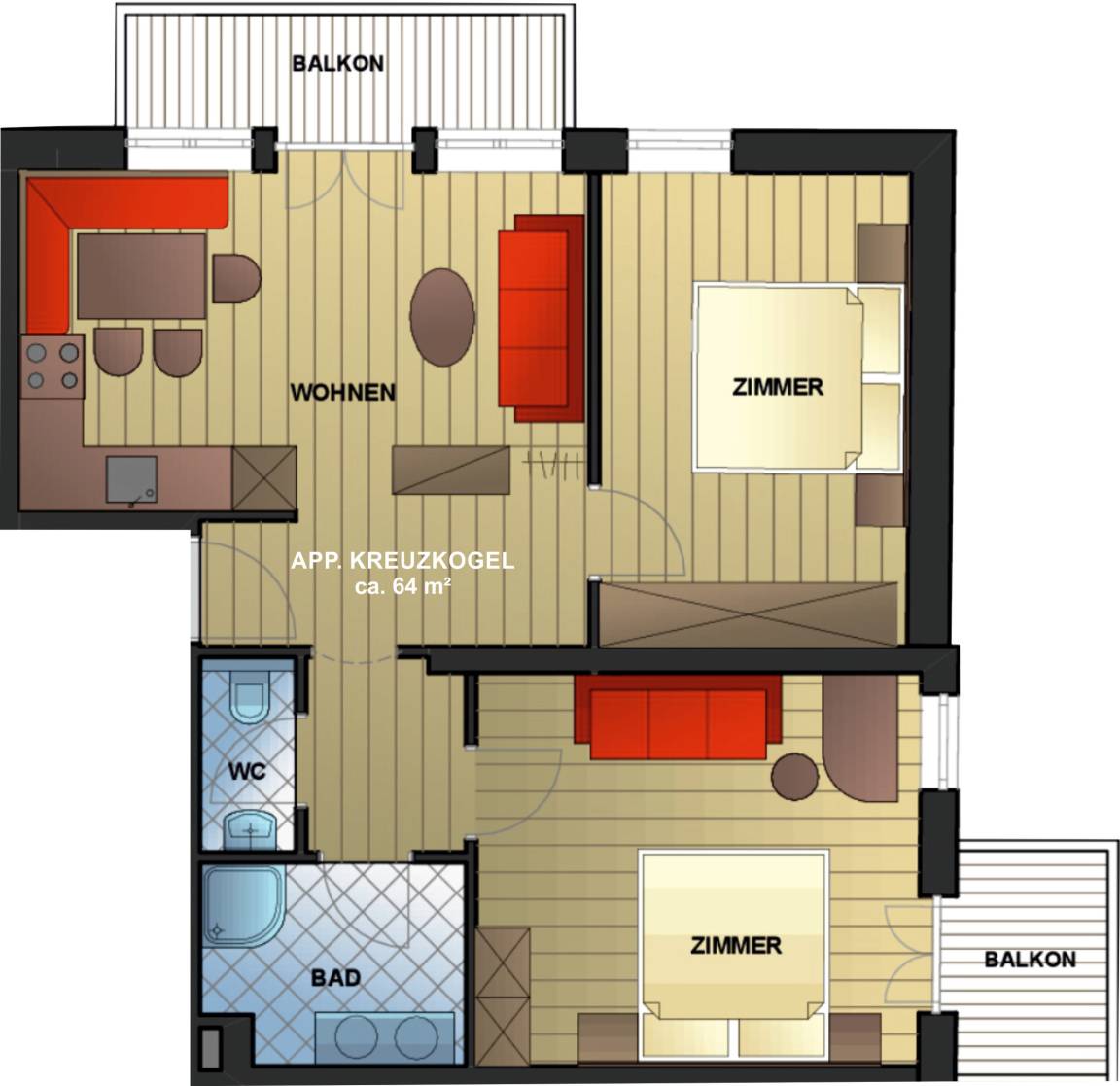 Das Appartement ist westlich ausgerichtet, hat 64 m² und bietet Platz für max. 6 Personen.