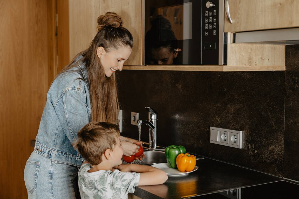 -Komplettausstattung der Küche mit Backrohr, E-Herd mit Cerankochfeld, Geschirrspüler, Wasserkocher, Kaffeemaschine und Kühlschrank mit Gefrierfach