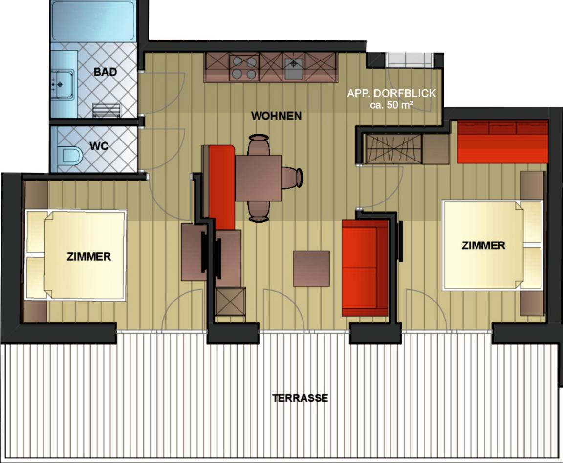 Das Appartement Dorfblick hat ein Ausmaß von ca. 53 m² und bietet genug Platz für 4 bis 7 Personen. Die große Terrasse zur Alleinnutzung lädt zum Verweilen ein. Genießen Sie dabei die herrliche Aussicht auf die Großarler Bergwelt.