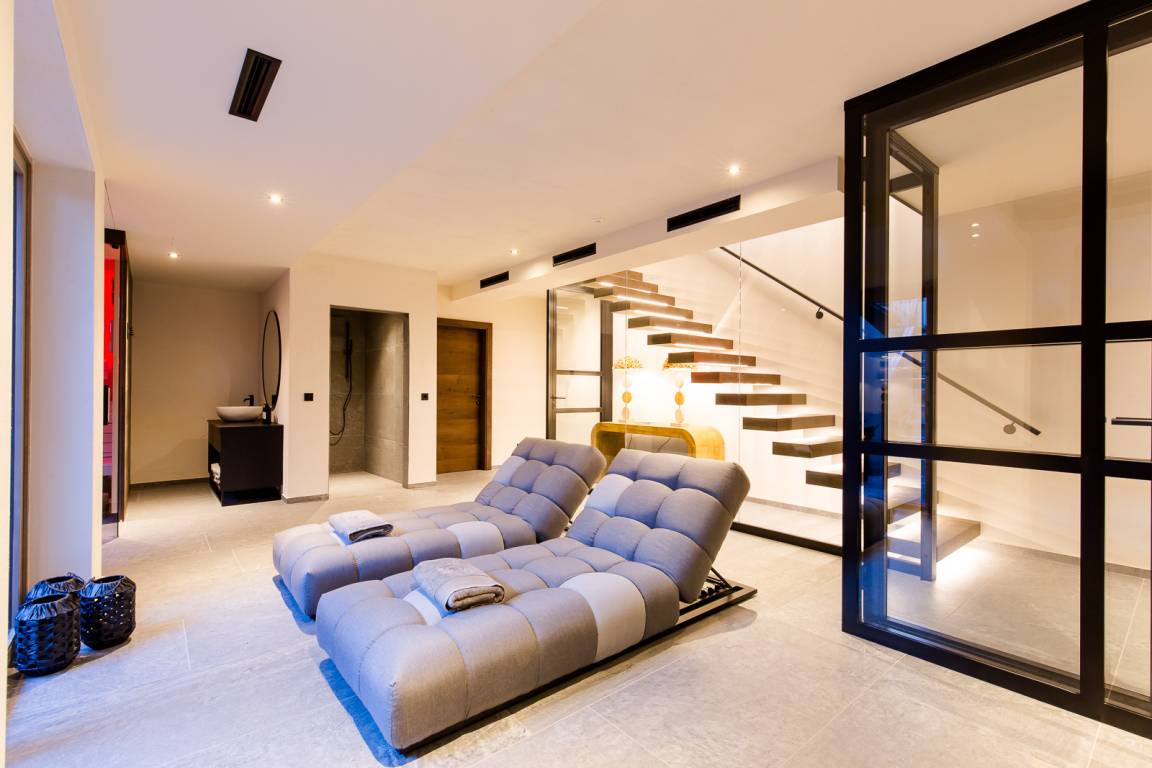 Beim Bau dieses Chalets haben wir die altbewährten Materialien der alpinen Architektur gewählt und in die heutige Zeit übersetzt. Eisen, Glas, Wasser, Stein und Lärchenholz vermitteln Geborgenheit. Die offene Architektur fördert das Zusammensein. Rückzugsgebiete garantieren Ruhe und Intimität.