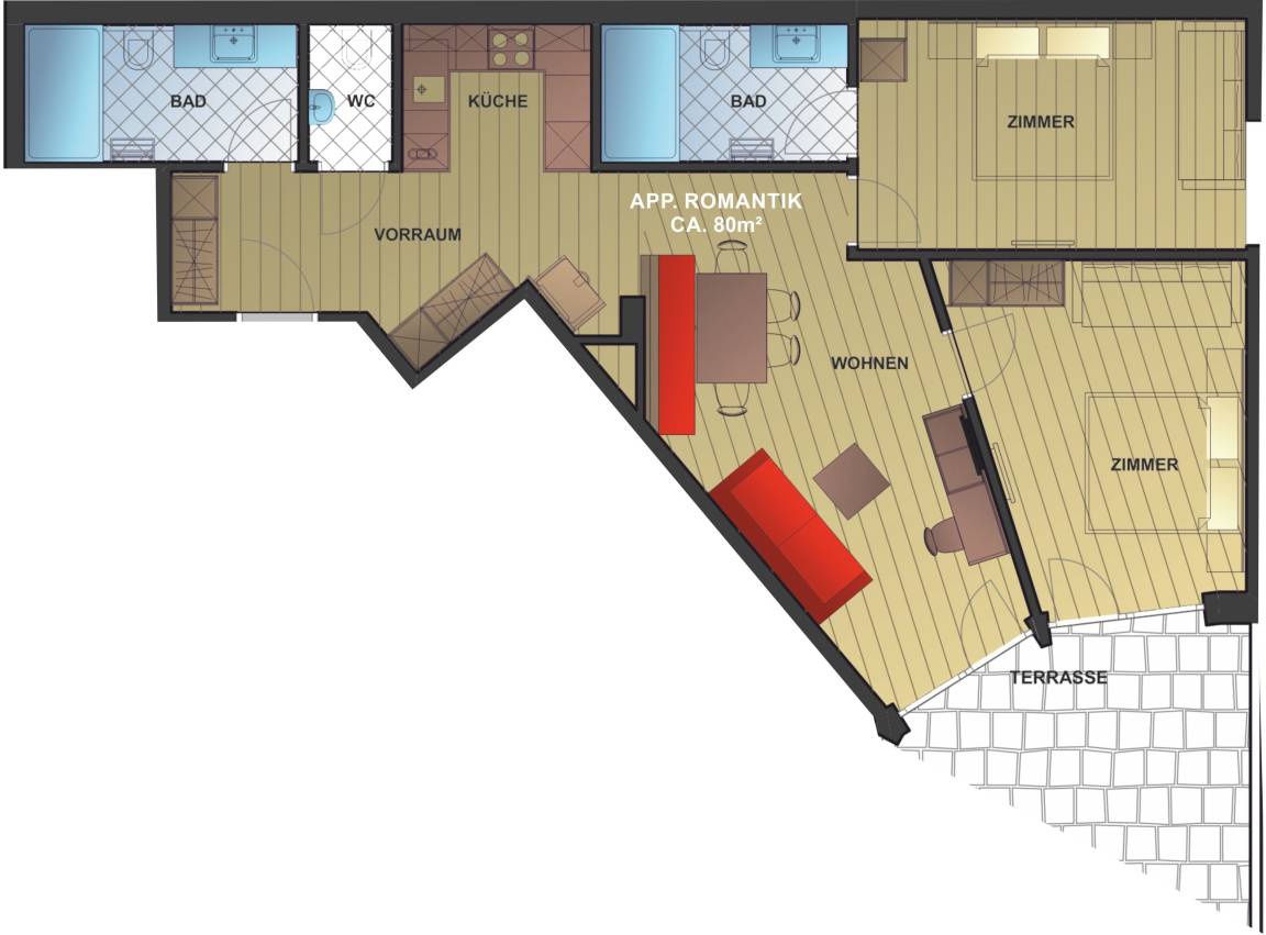 Das Appartement Romantik ist 80 m² groß und bietet genug Platz für 4 bis 8 Personen. Die Einrichtung ist im alpinen Stil und die großzügige Küchenzeile ist komplett ausgestattet. 2 komplette Sanitäreinrichtungen sowie ein zusätzliches WC sorgen für noch mehr Komfort. Die große Terrasse lockt zum Verweilen ein.