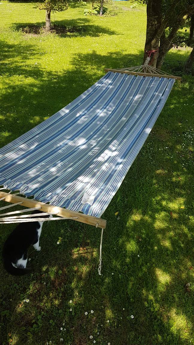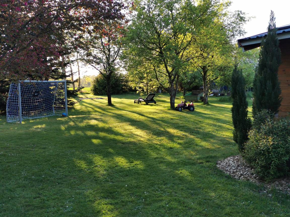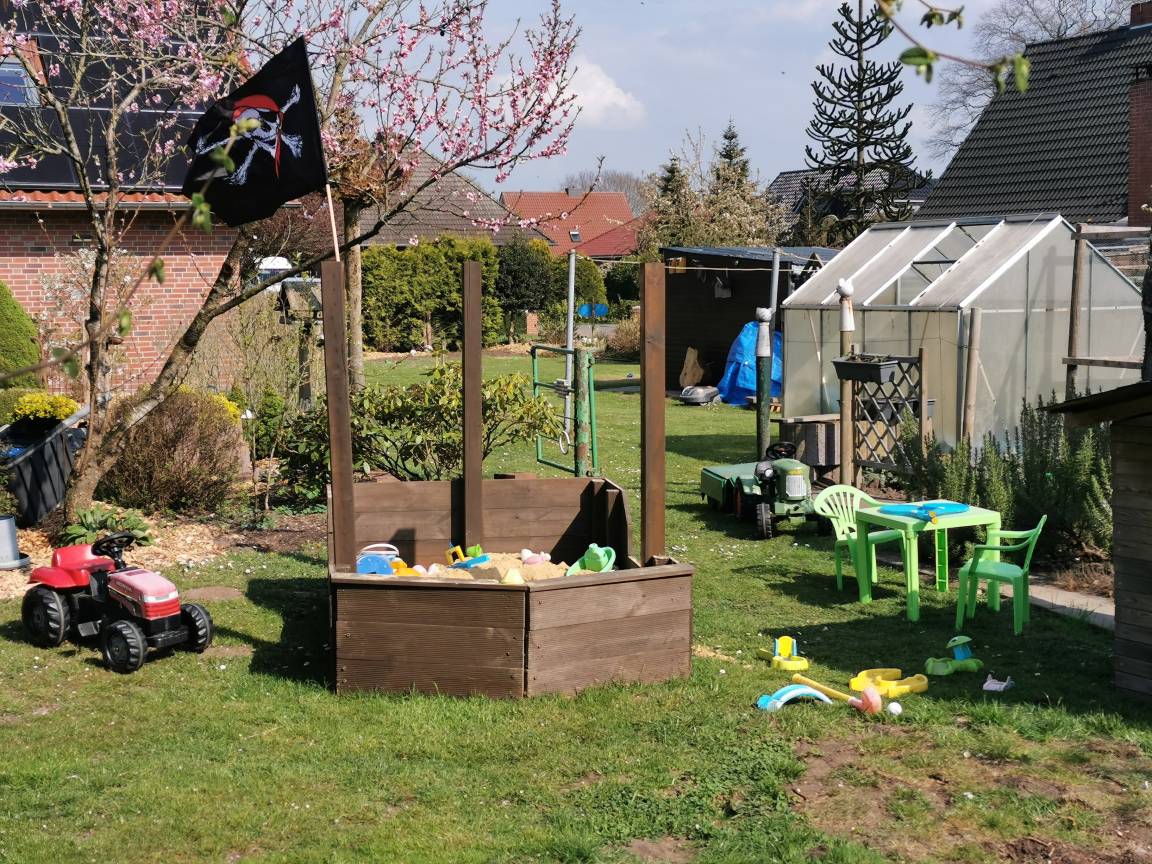 Basketballkorb, Federballschläger und bei gutem Wetter ein kleines Planschbecken bereit.