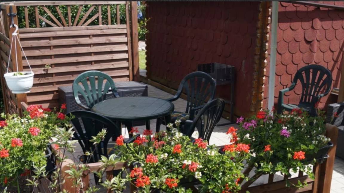 Hier steht Ihnen eine eigene Terrasse mit Gartenmöbeln und Grill