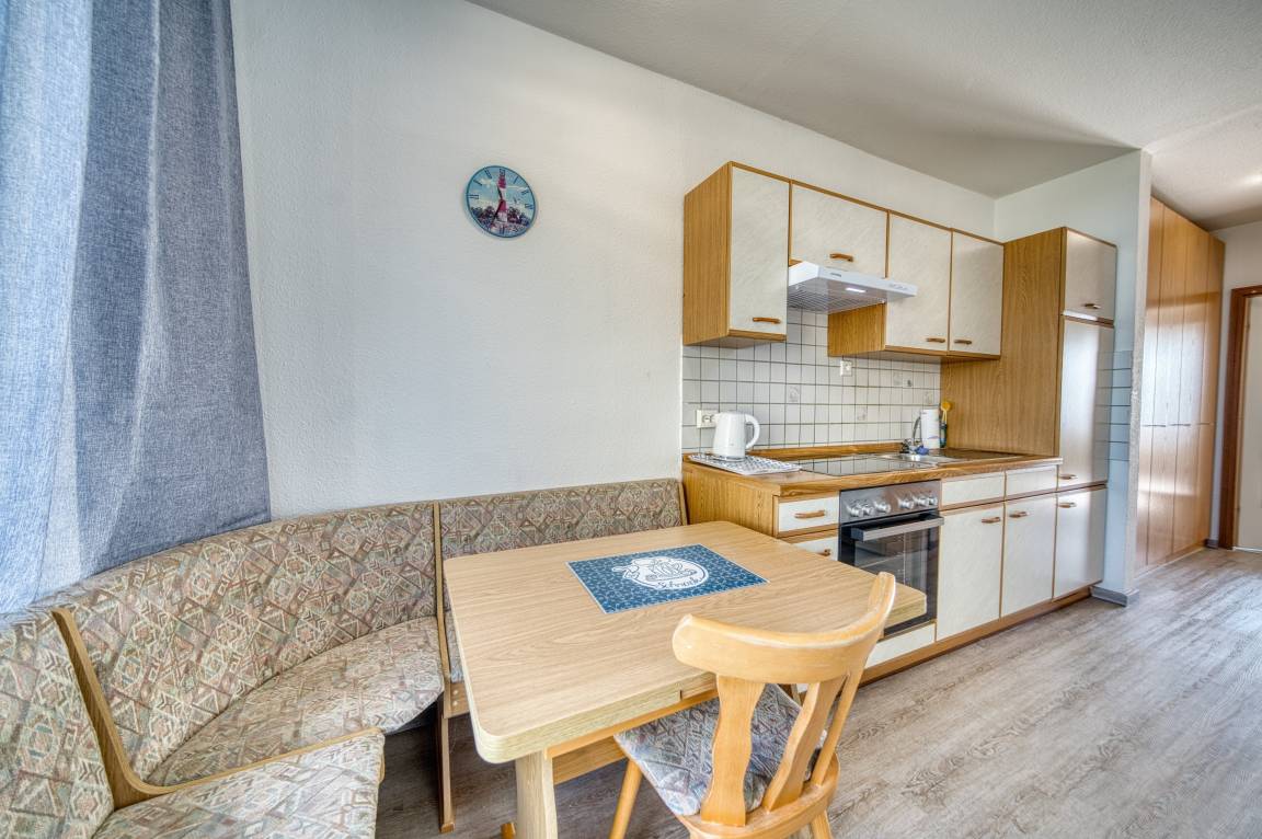 Komfort: Vollausgestattete Küche (mit Backofen), gemütliche Essecke und Bad mit Wanne.
