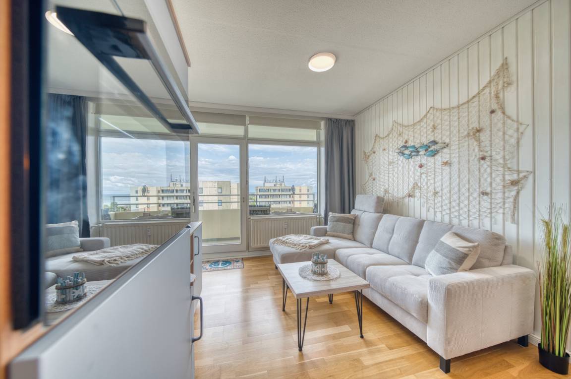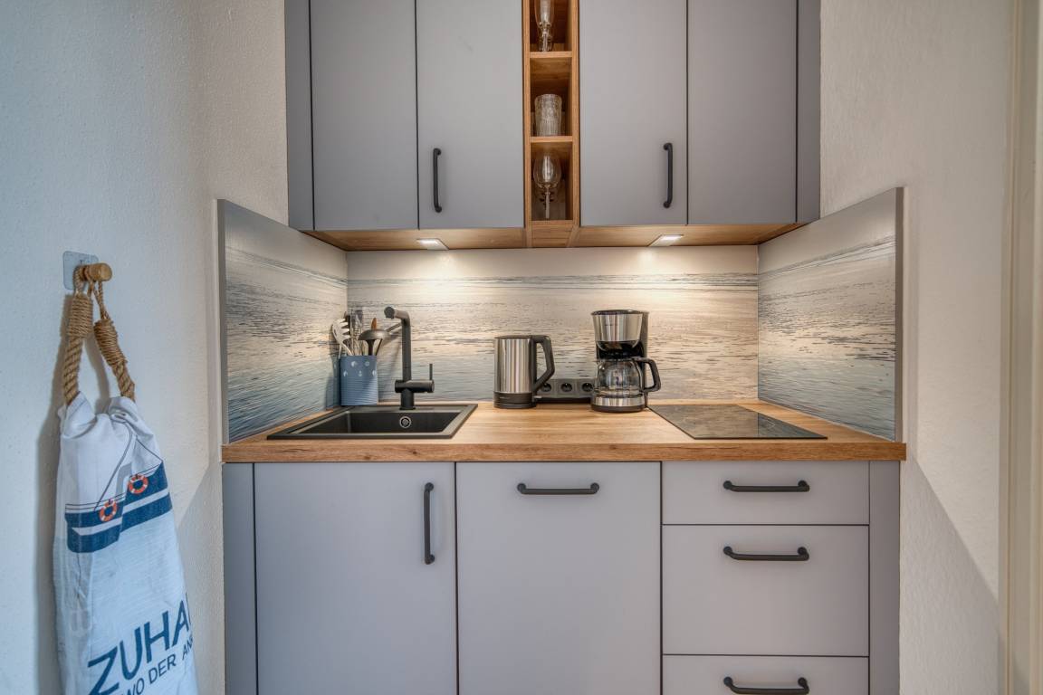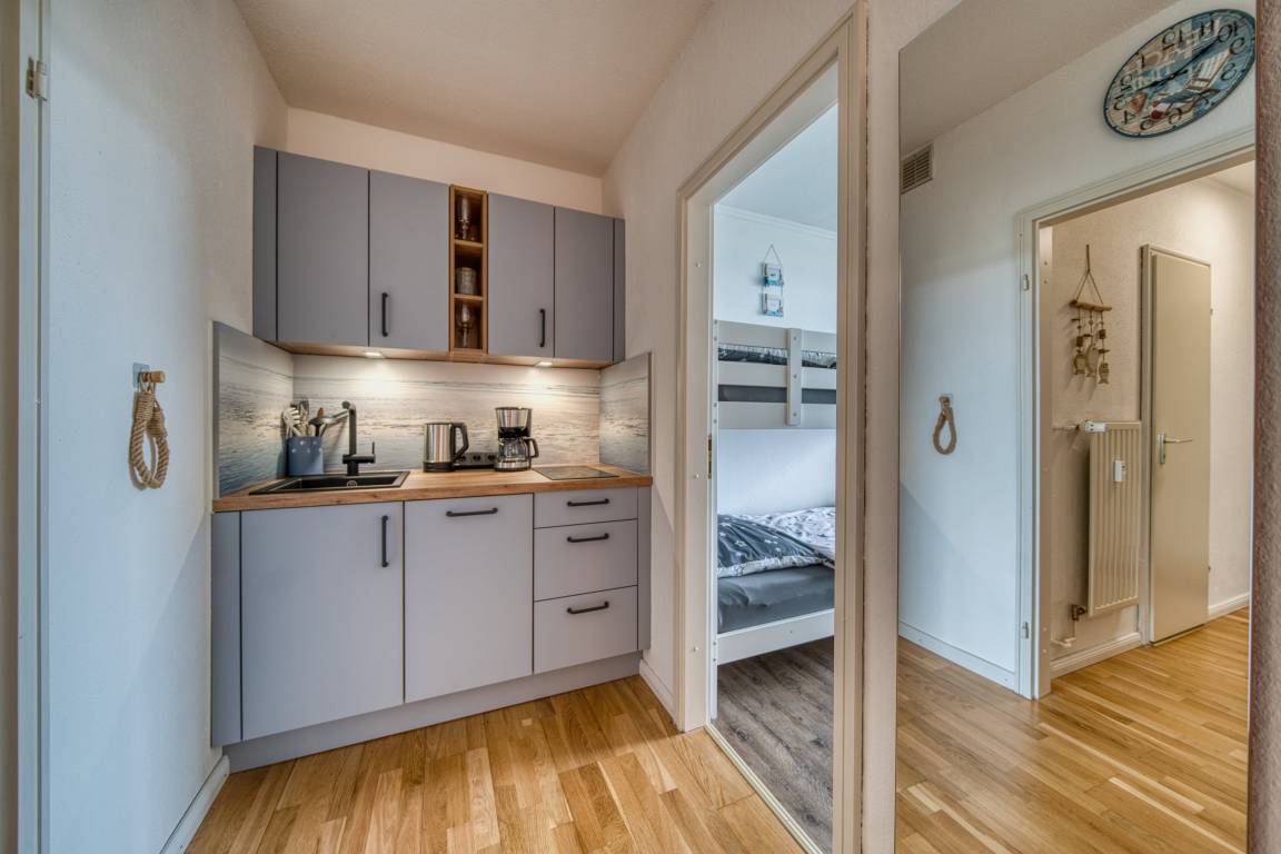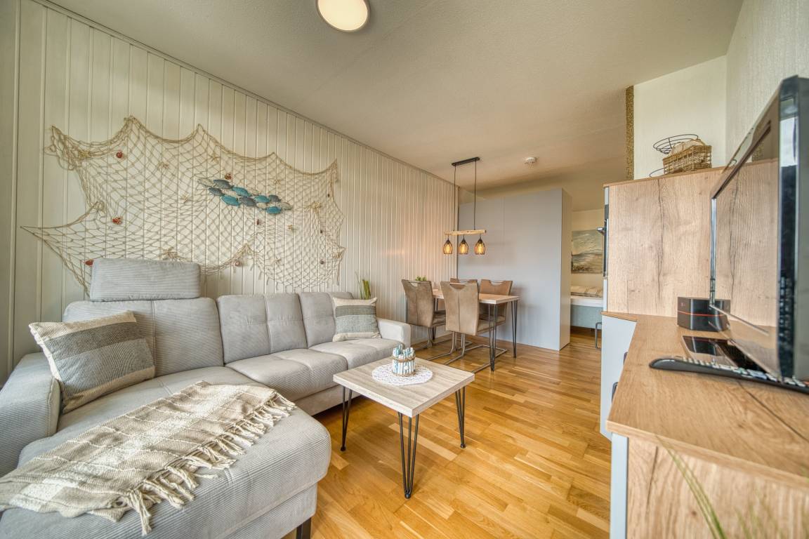 Die Küchenzeile ist voll ausgestattet mit Geschirrspüler, Backofen, Induktionskochfeld, Kaffeemaschine und Kühlschrank mit Gefrierfach. Das Wohnzimmer lädt mit bequemer Couch zum Verweilen ein, der Balkon bietet seitlichen Meerblick. Modernes Bad mit flachem Duscheinstieg sorgt für Komfort.