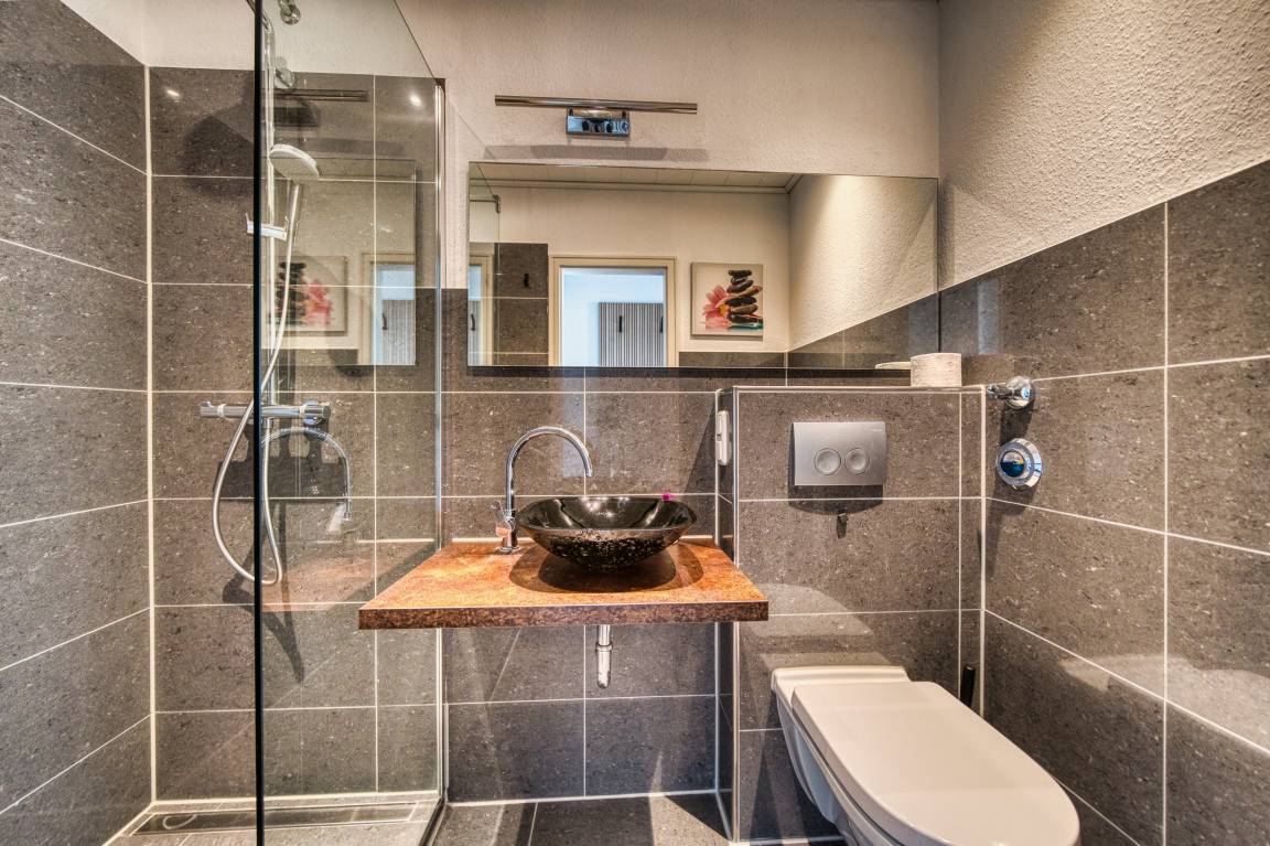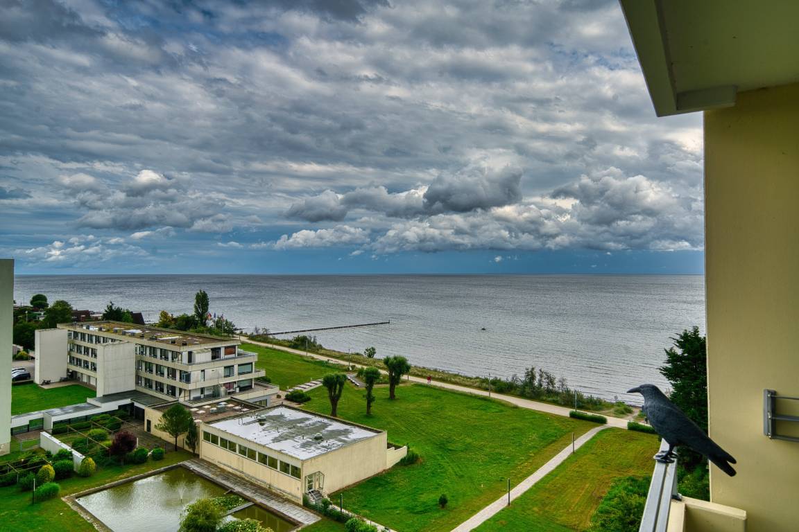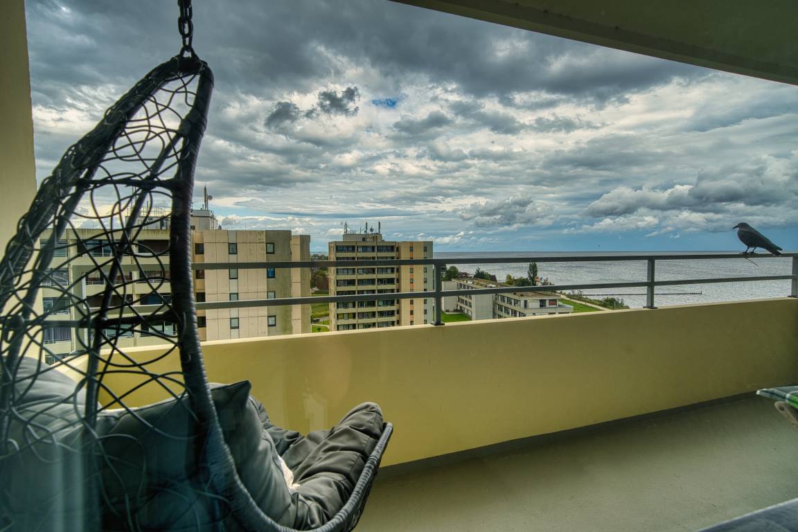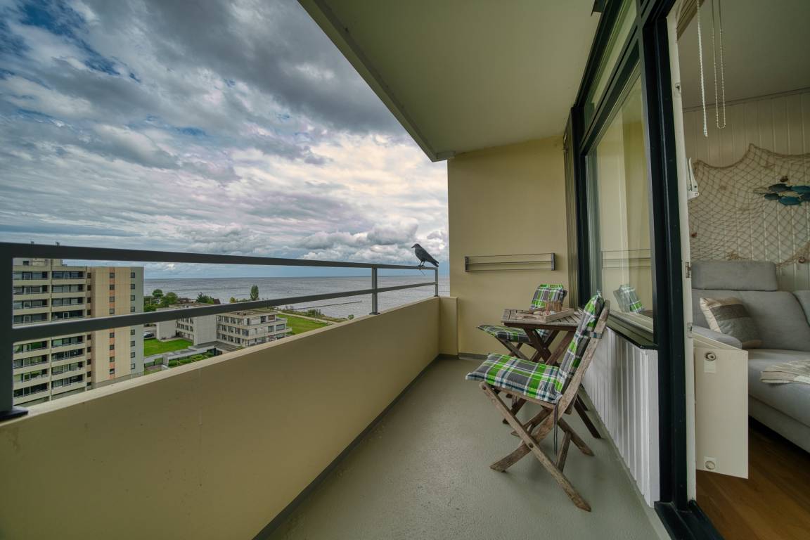 Die Küchenzeile ist voll ausgestattet mit Geschirrspüler, Backofen, Induktionskochfeld, Kaffeemaschine und Kühlschrank mit Gefrierfach. Das Wohnzimmer lädt mit bequemer Couch zum Verweilen ein, der Balkon bietet seitlichen Meerblick. Modernes Bad mit flachem Duscheinstieg sorgt für Komfort.