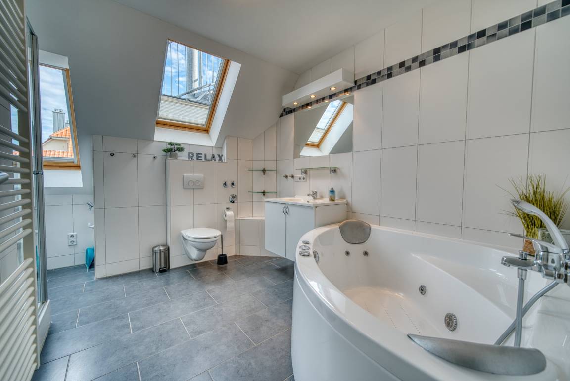 Badezimmer mit Regendusche, Whirlpool und Sauna. Fußbodenheizung in Wohnräumen, Küche und Bad.