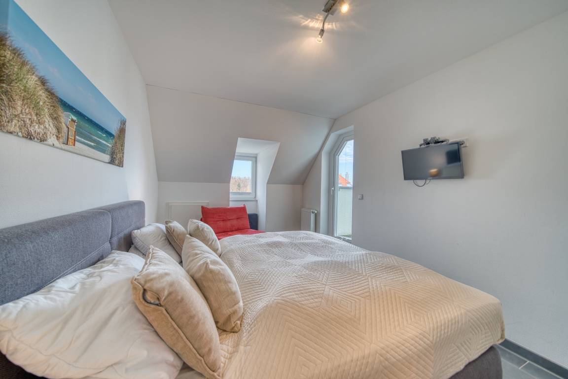 Zwei Schlafzimmer mit Doppelbett, Kleiderschrank und SAT-TV, beide mit Zugang zur kleinen Dachterrasse.