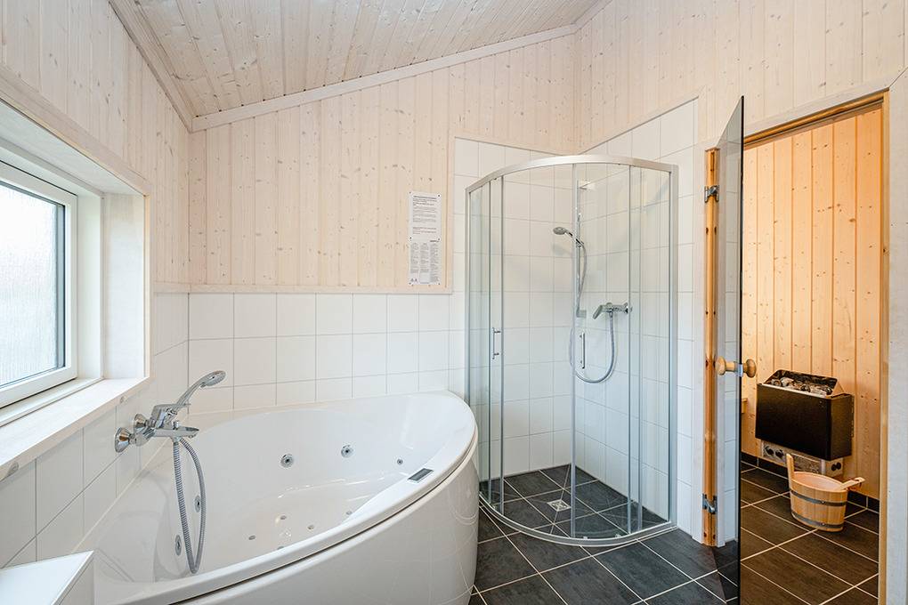 Haus: Gepflegtes Ferienresort mit farbenfrohen skandinavischen Ferienhäusern. Alle Ferienhäuser mit Sauna und Kaminofen. Helle, bis zum Dachgiebel ausgebaute Wohn-/Essbereiche mit großen Fensterfronten. Ansprechende Einrichtung, moderne Komfortausstattung. Internetzugang für bis zu 3 Geräte über W-Lan, Flachbild-Sat-TV, DVD, Radio/CD. Bäder mit Fußbodenheizung, Haarfön, Waschmaschine/Trockner, meist Whirlpool. Elektroheizung. Nichtraucherhäuser. Teilüberdachte Holzterrasse mit Sitz- und Liegemöbeln, Grill. Pkw-Stellplatz am Haus, weitere Stellplätze bei der Rezeption (je nach Verfügbarkeit).