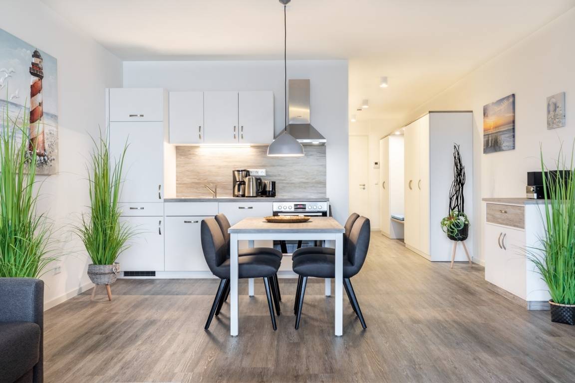 Das lichtdurchflutete und familienfreundliche Nichtraucher-Apartment ist barrierearm und verfügt über Fußbodenheizung, sonnenschutzverglaste und bodentiefe Fensterflächen, kostenfreies WLAN und eine voll ausgestattete offene Küche mit Geschirrspüler, Kühlschrank und Gefrierfach, Kaffeemaschine, Toaster, Wasserkocher, Herd mit Glaskeramikkochfeld und Backofen.