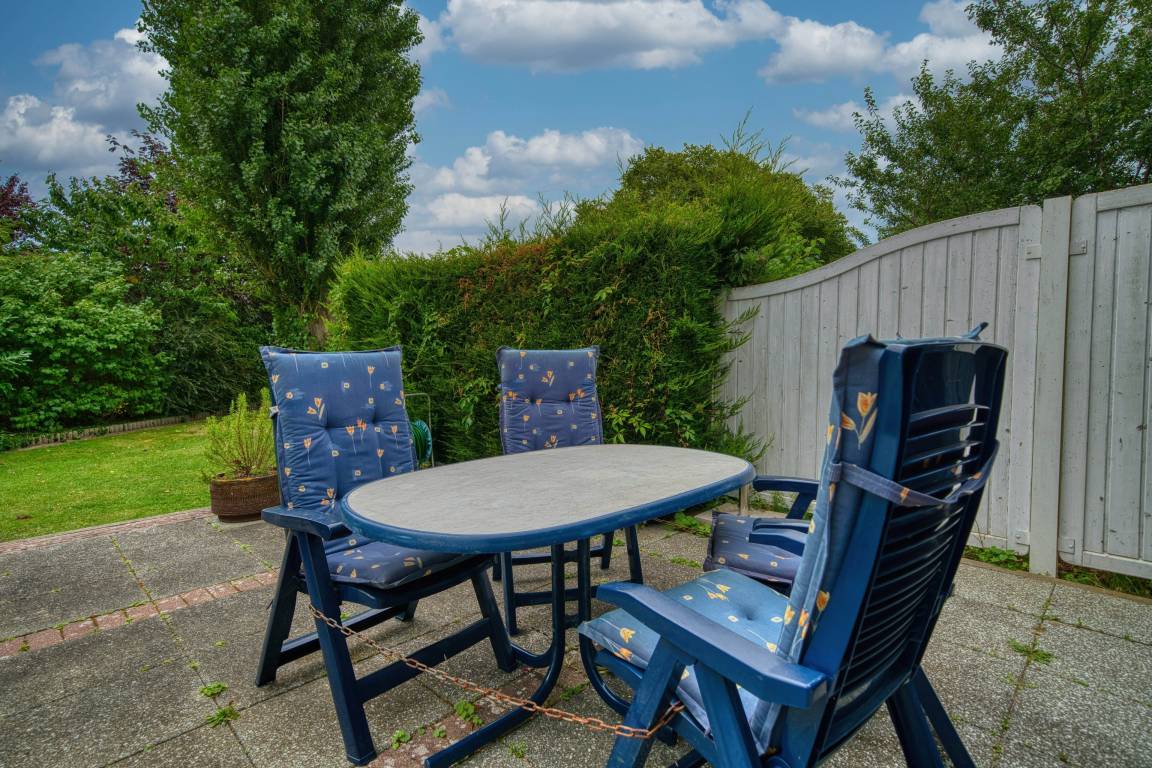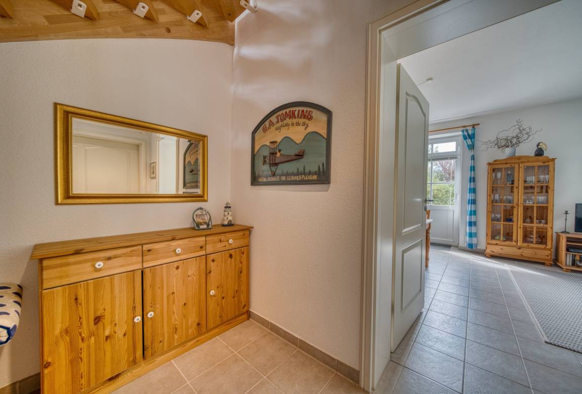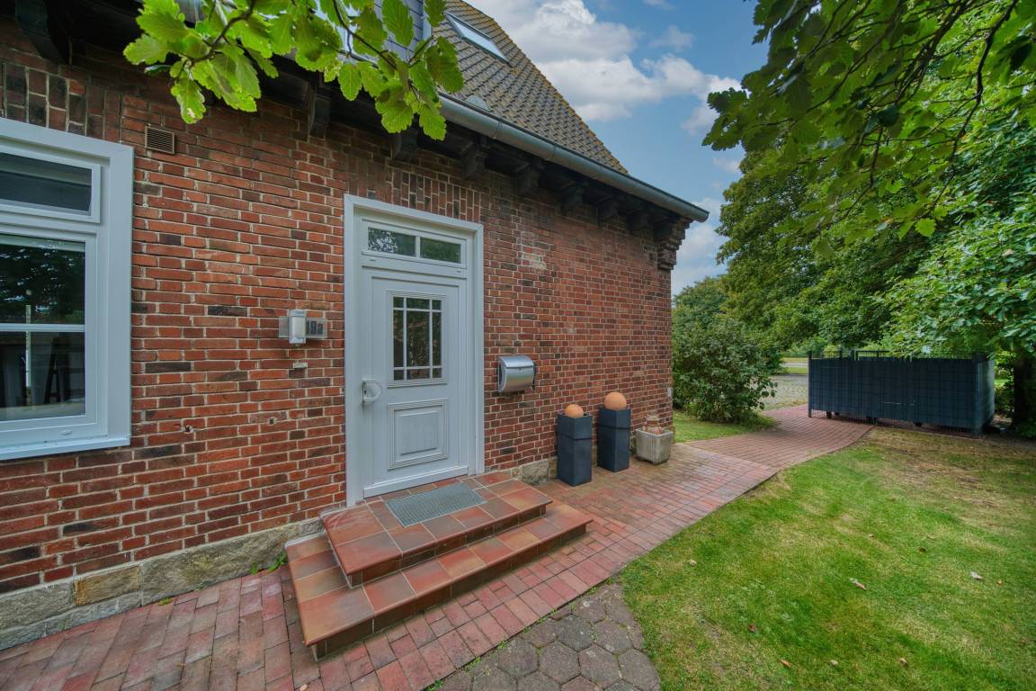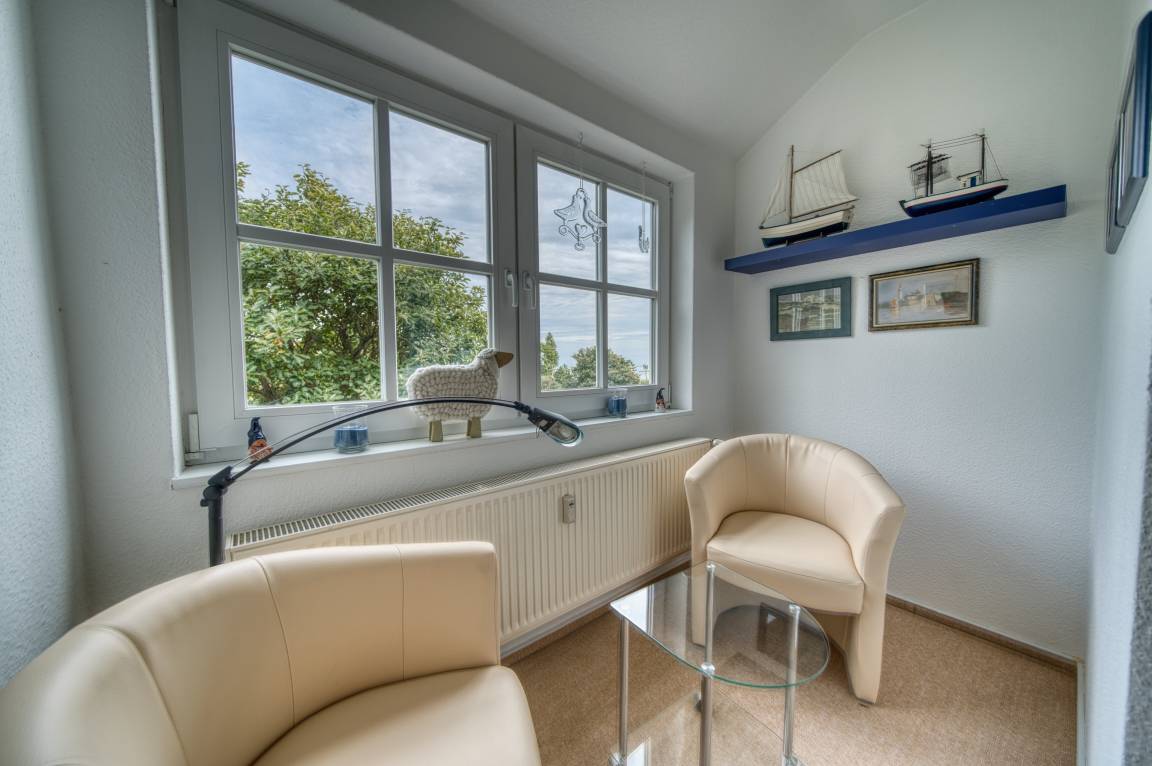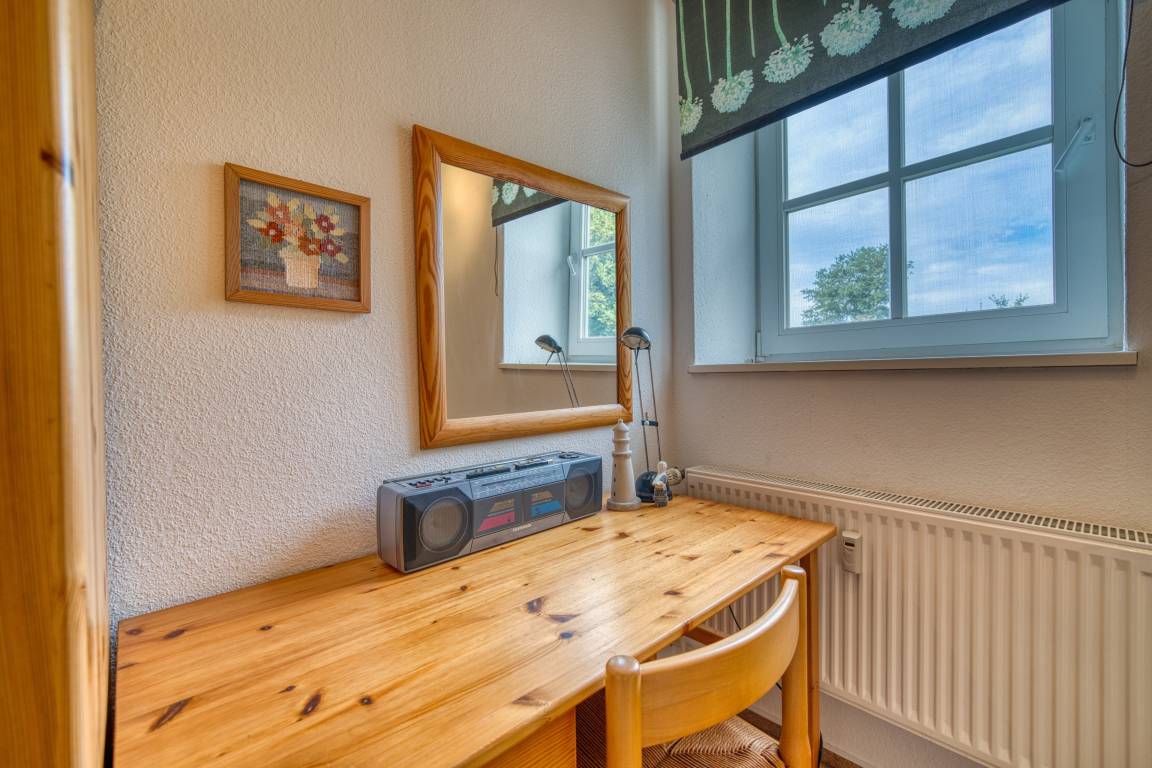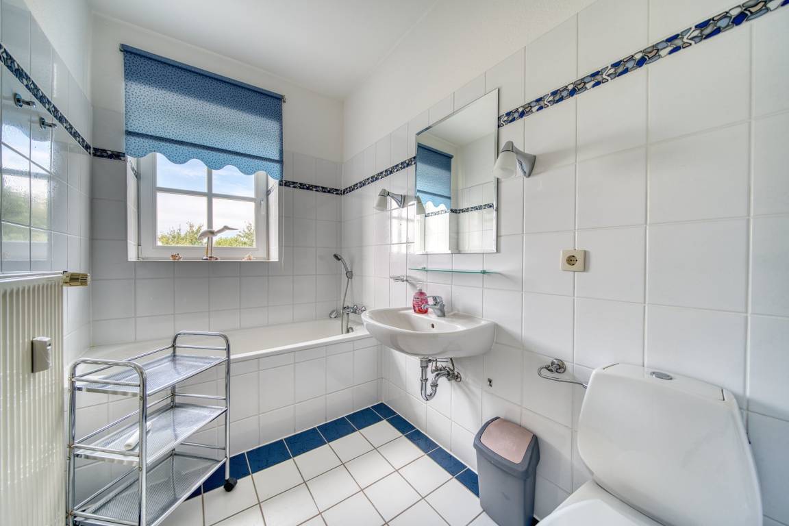 Im Obergeschoss befinden sich das Elternschlafzimmer mit Doppelbett, ein Kinderzimmer mit zwei Einzelbetten sowie ein weiteres Bad mit Badewanne. Große Fenster sorgen in allen Räumen für viel Tageslicht. Ein kostenfreier Parkplatz am Haus und die Nähe zu Radwegen runden das Angebot ab.