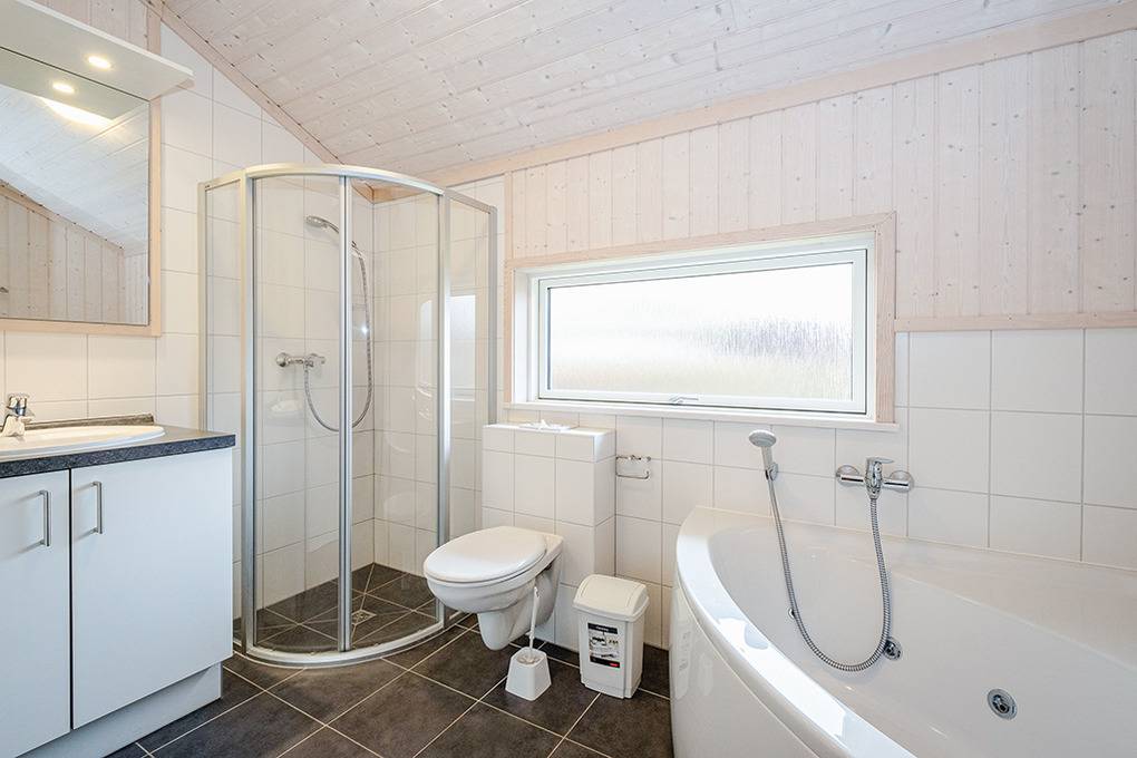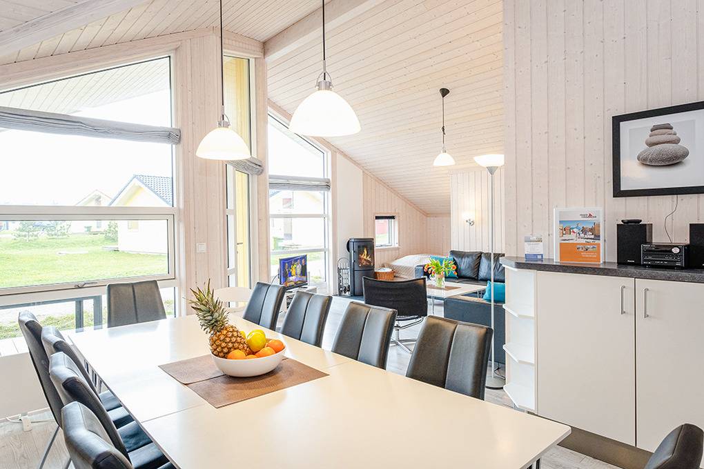 Haus: Gepflegtes Ferienresort mit farbenfrohen skandinavischen Ferienhäusern. Alle Ferienhäuser mit Sauna und Kaminofen. Helle, bis zum Dachgiebel ausgebaute Wohn-/Essbereiche mit großen Fensterfronten. Ansprechende Einrichtung, moderne Komfortausstattung. Internetzugang für bis zu 3 Geräte über W-Lan, Flachbild-Sat-TV, DVD, Radio/CD. Bäder mit Fußbodenheizung, Haarfön, Waschmaschine/Trockner, meist Whirlpool. Elektroheizung. Nichtraucherhäuser. Teilüberdachte Holzterrasse mit Sitz- und Liegemöbeln, Grill. Pkw-Stellplatz am Haus, weitere Stellplätze bei der Rezeption (je nach Verfügbarkeit).