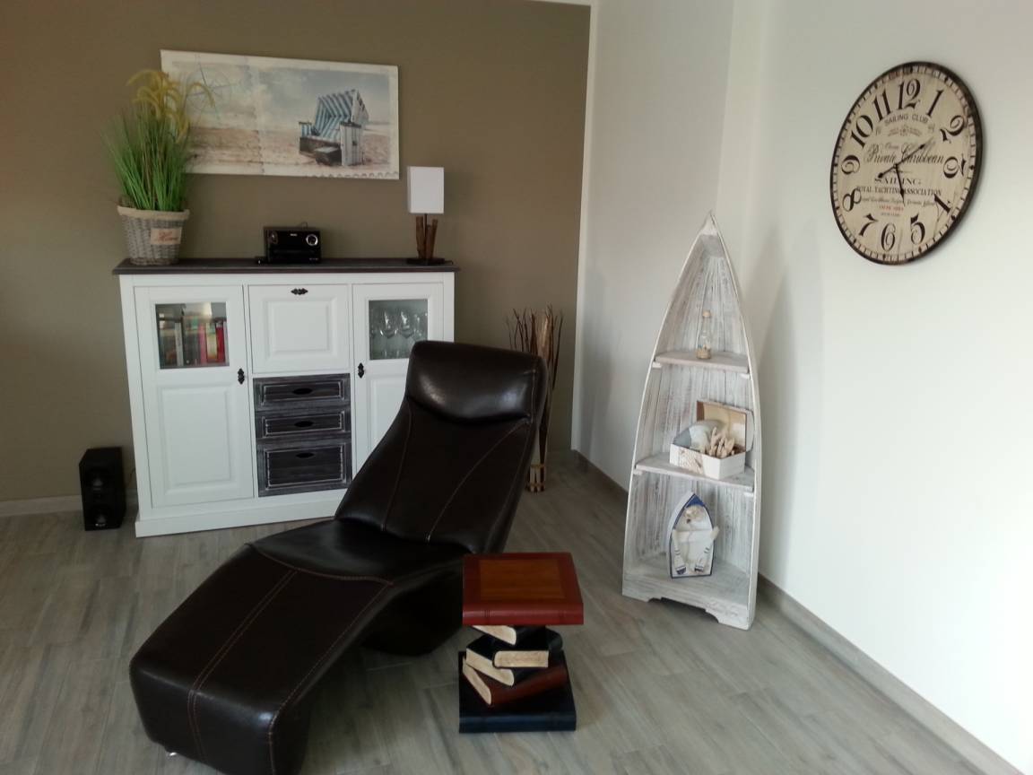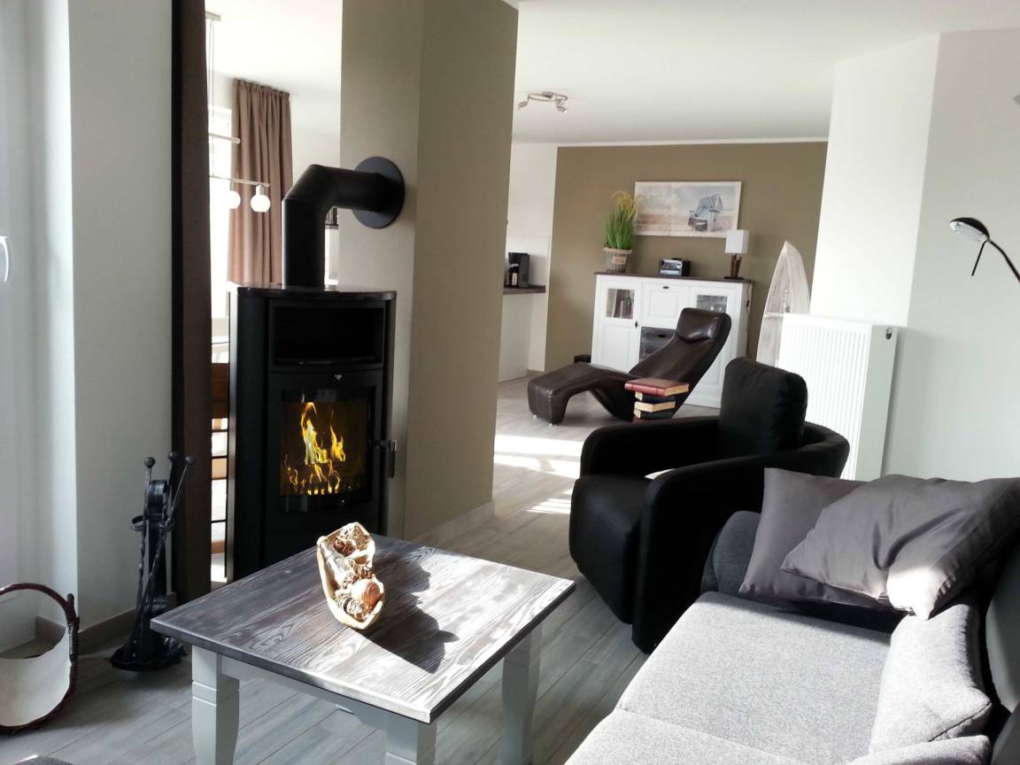 Das großzügige Wohn- Esszimmer mit integrierter Küche verfügt über eine kuschelige Ausziehcouch und einen gemütlichen Essbereich, ausgestattet mit einem Flatscreen-TV, Blueray-Player, Stereo-Anlage und einer Nintendo Wii. Die große Dachterrasse betreten Sie von hier aus. Wie wär' s mit einer Auszeit im vorhandenen Strandkorb?