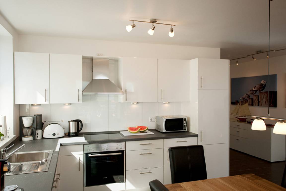 Der große Wohnraum mit Kaminofen, Essbereich und offener Küche ist lichtdurchflutet und bietet einen Blick bis auf die Ostsee. Von der Terrasse gelangen Sie in den hauseigenen Garten und haben hier direkten Zugang zum Strand (30 Schritte). In der Küche finden Sie von der Spülmaschine über eine Nespresso-Maschine bis zum Pürierstab alles, was man für gemeinsame Kochaktionen benötigt.