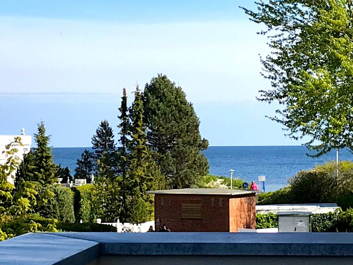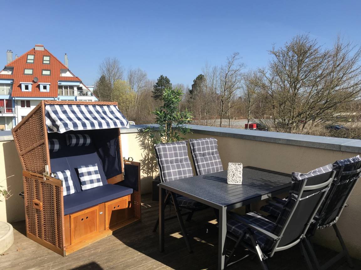 Genießen Sie die 18 m² Dachterrasse mit Meerblick und entspannen Sie im Strandkorb.