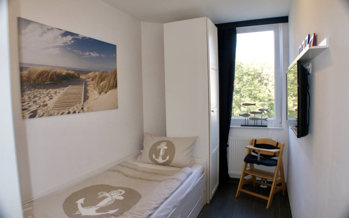 Die Ferienwohnung verfügt über zwei Schlafzimmer – Das erste Schlafzimmer ist ausgestattet mit Boxspringbett sowie einem Smart-TV. Das weitere Schlafzimmer mit einem gemütlichem Kojenbett, das auf gleicher Höhe ausgezogen werden kann.