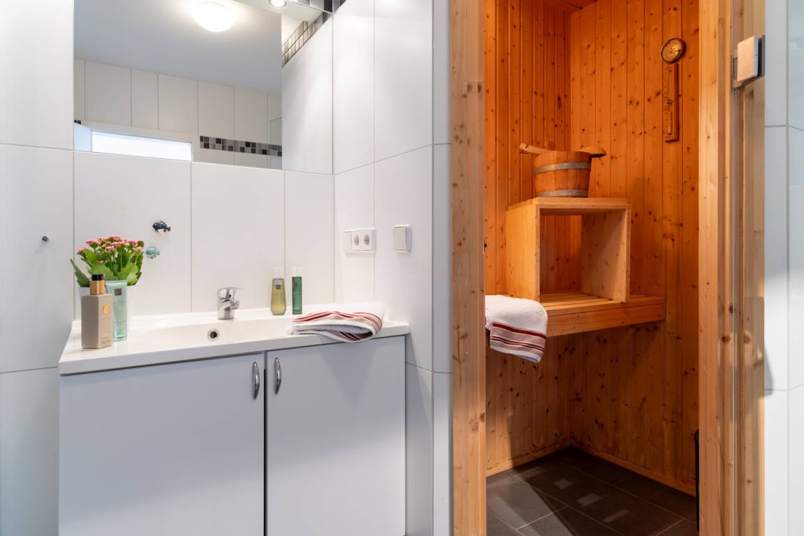 Die Krönung eines jeden Tages bietet das atemberaubende Wellnessbad mit Sauna und Whirlpool, das Sie einlädt, ein paar Stunden in einem harmonischen Ambiente bei Kerzenschein entspannen zu können.