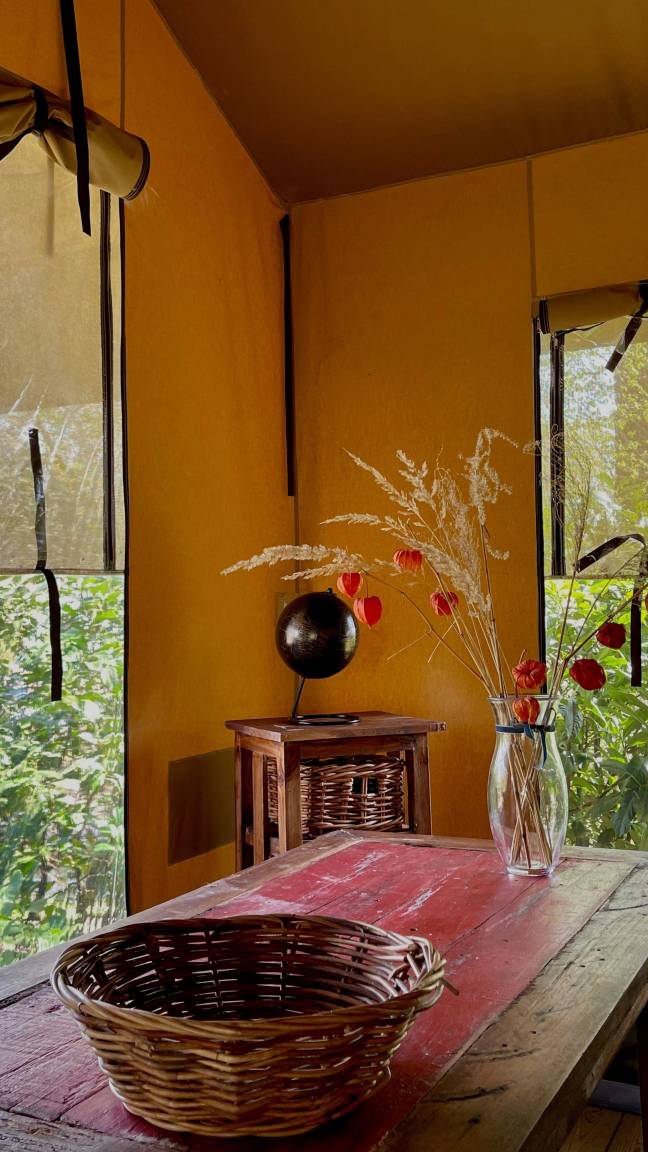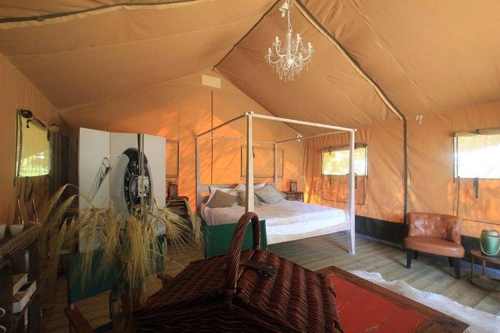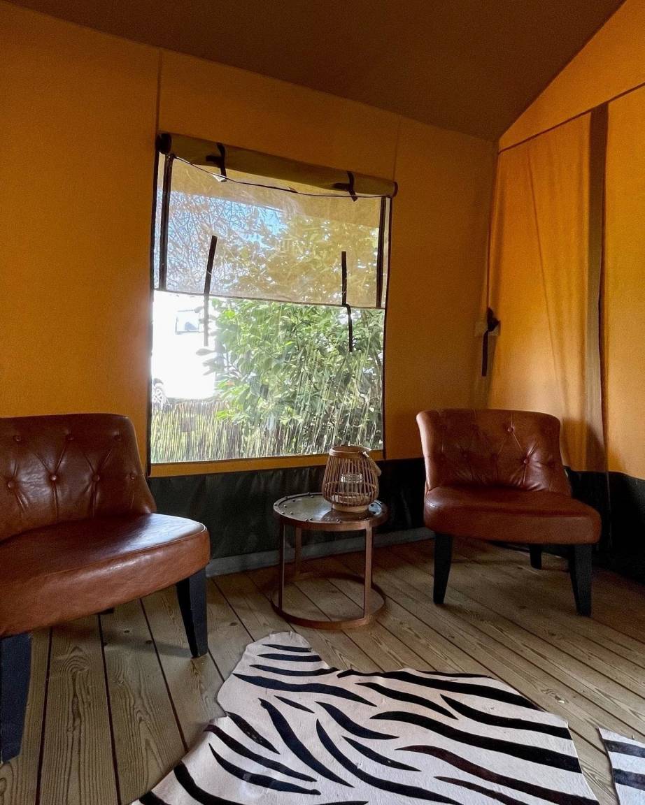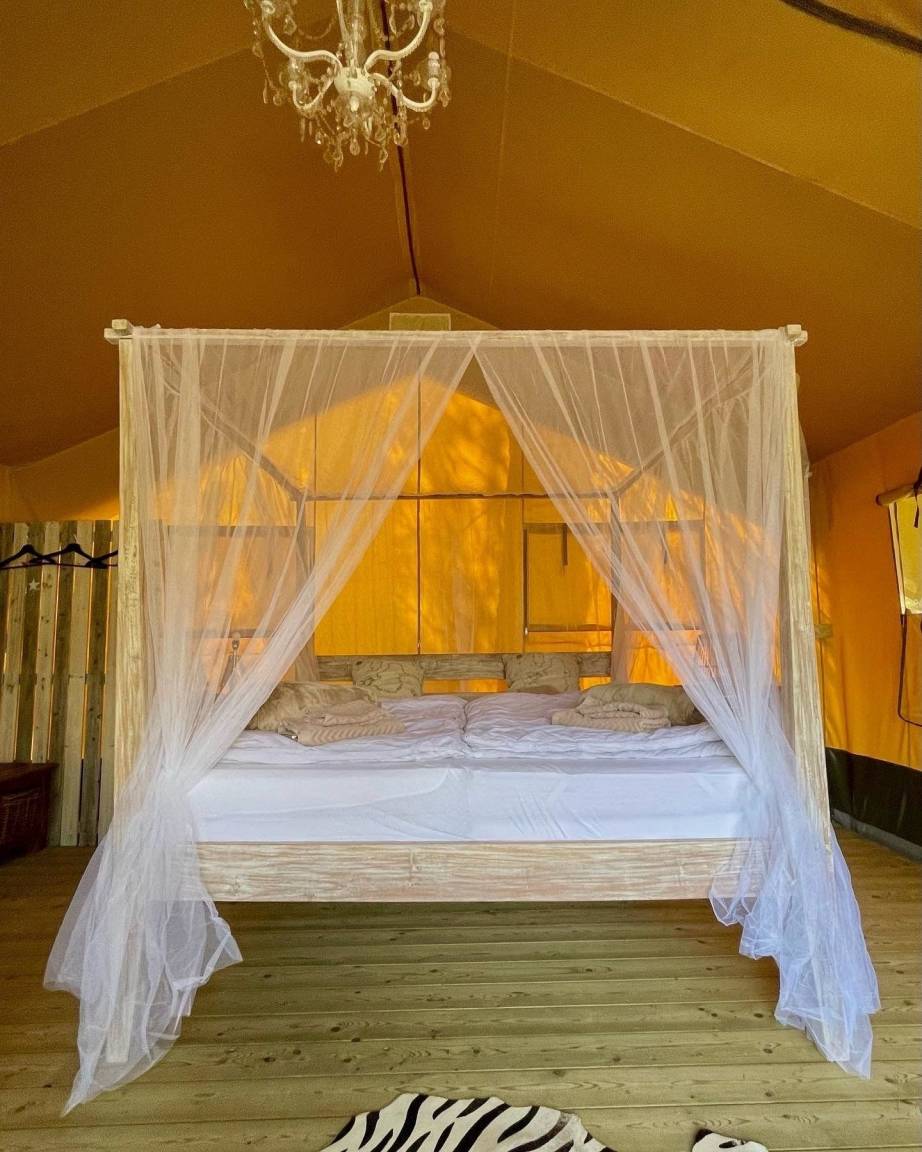 Das Safari Zelt verfügt über ein Himmelbett, Kronleuchter, Essecke, Loungesessel, eine überdachte Außenterrasse.