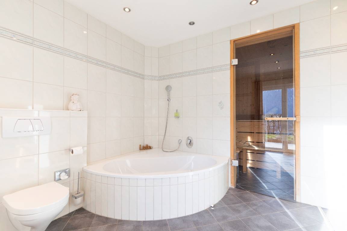 Badezimmer gelangen Sie direkt in die Zirbenholzsauna.