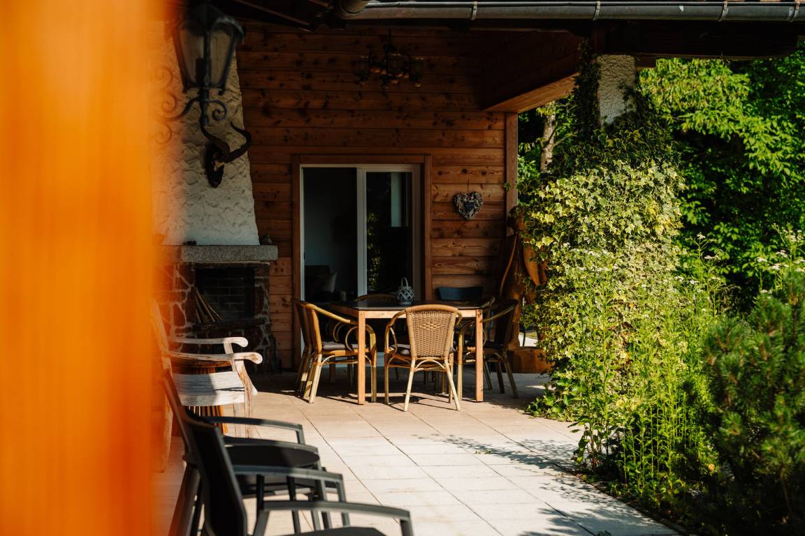 - Überdachte und geschützte Terrasse mit herrlichem Bergblick, Esstisch und offenem Kamin mit Kaminholz