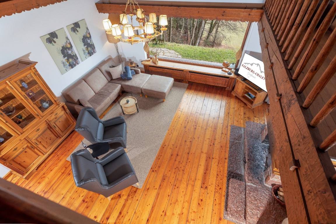 massiver Natur-Lärchenboden, Leder-Relaxsessel. Vom Wohnzimmer aus gelangt man über eine Treppe auf eine Galerie, für Sie