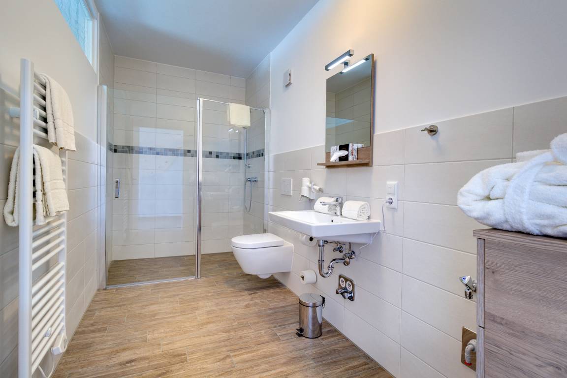 - Badezimmer mit WC und ebenerdiger Dusche sowie Fön