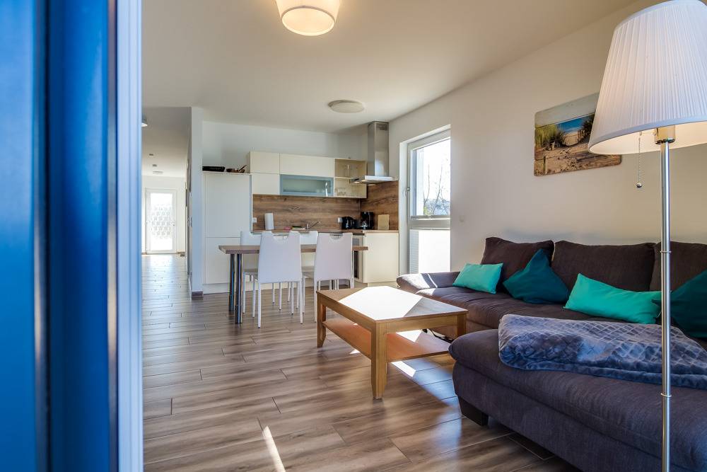 Die großzügigen Ferien-Appartements sind jeweils mit einem Schlafzimmer (mit einem Doppelbett 160 x 200 cm), einem Badezimmer mit Dusche/WC und einem offen großzügigen Wohn-/Essbereich ausgestattet. Die komplett eingerichtete Einbauküche sowie die bequeme Wohnlandschaft und der angrenzende Balkon mit Hafenblick runden das Wohlfühlangebot ab.