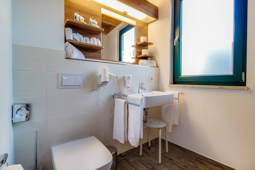 - Badezimmer mit WC und ebenerdiger Dusche sowie Fön