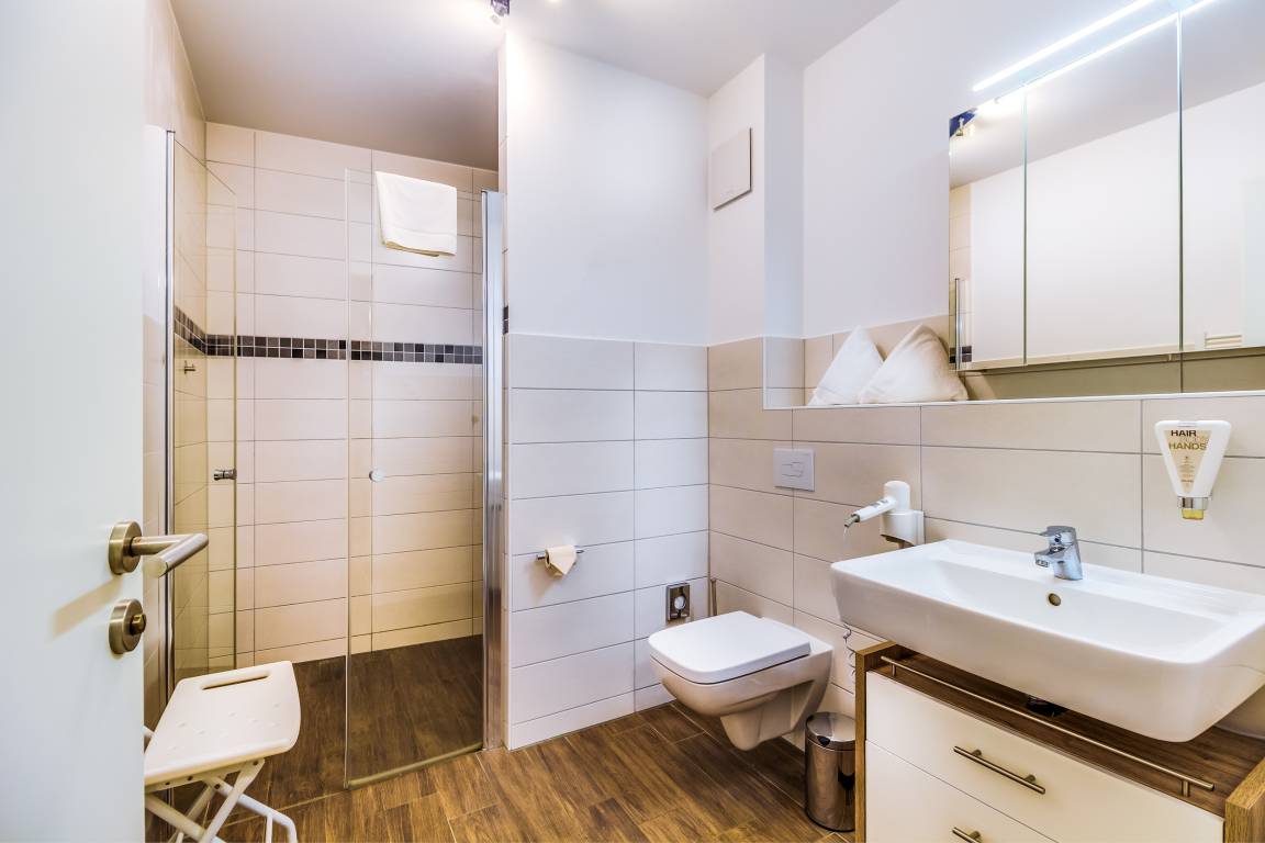 - Badezimmer mit WC und ebenerdiger Dusche sowie Fön