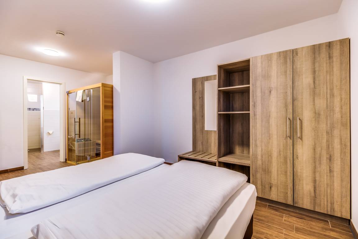 - Schlafzimmer mit Doppelbett (180 x 200 cm) und Kleiderschrank, Safe