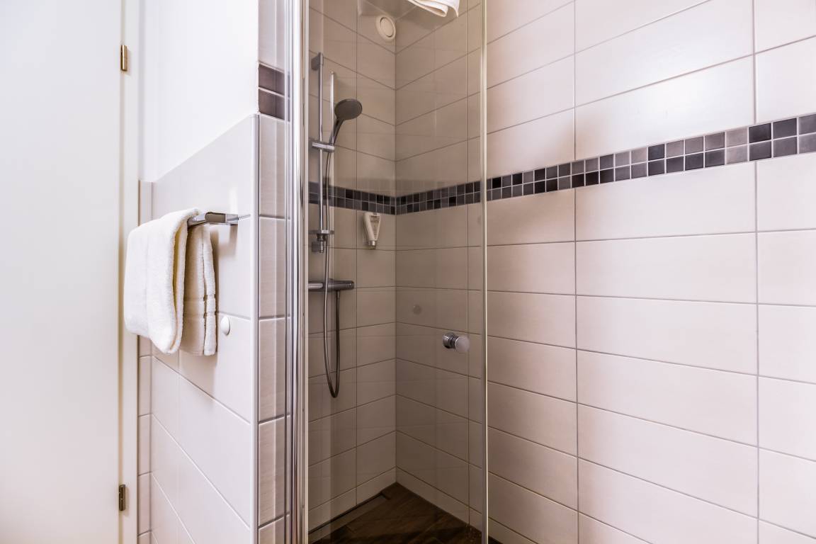 - Badezimmer mit WC und ebenerdiger Dusche sowie Fön
