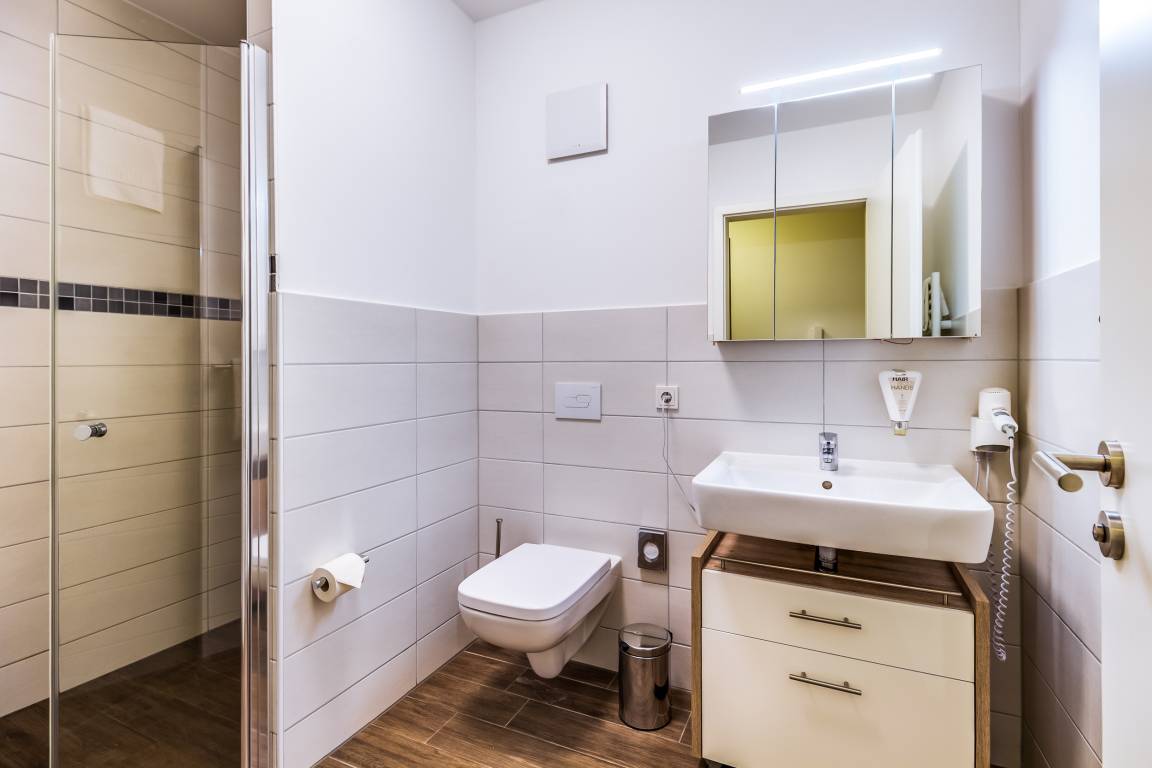 - Badezimmer mit WC und ebenerdiger Dusche sowie Fön