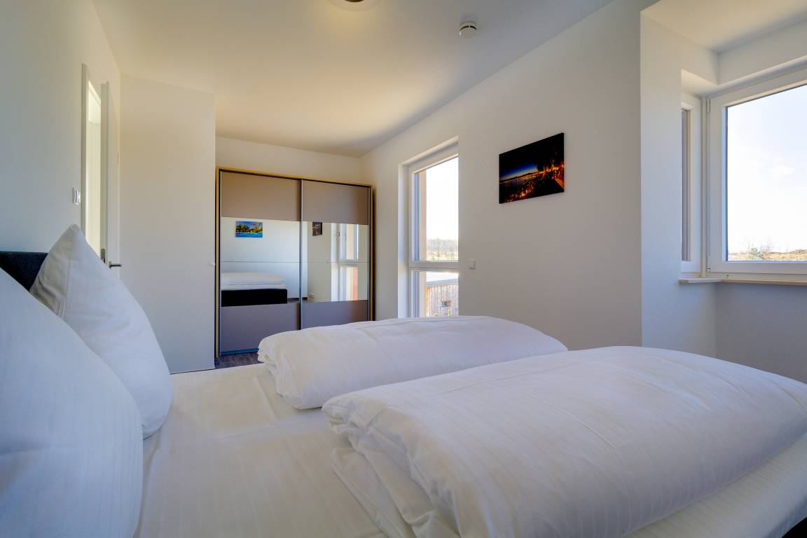 Die großzügigen Ferien-Appartements sind jeweils mit einem Schlafzimmer (mit einem Doppelbett 160 x 200 cm), einem Badezimmer mit Dusche/WC und einem offen großzügigen Wohn-/Essbereich ausgestattet. Die komplett eingerichtete Einbauküche sowie die bequeme Wohnlandschaft und der angrenzende Balkon mit Hafenblick runden das Wohlfühlangebot ab.