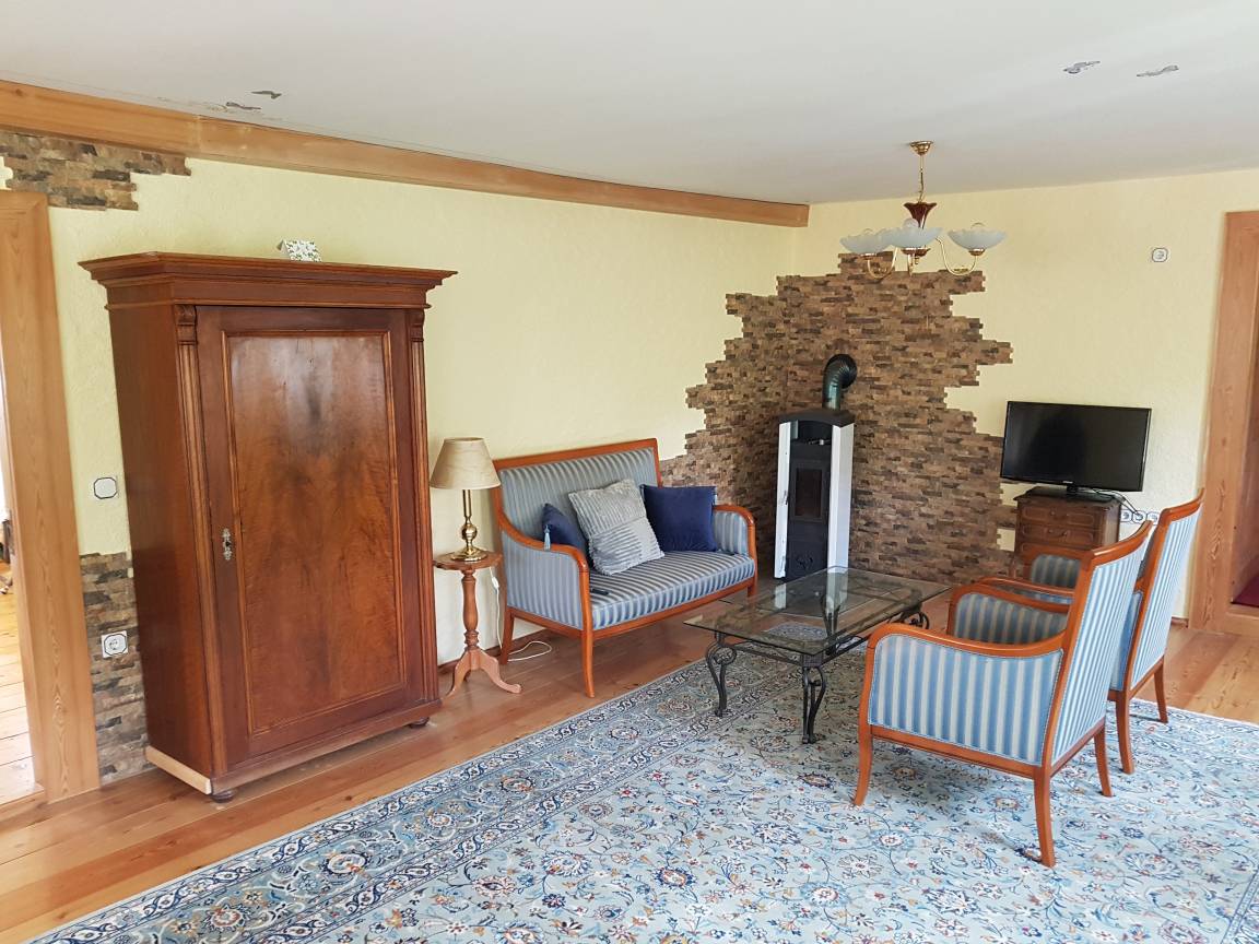Der Kaminofen im Esszimmer kann befeuert werden. Brennmaterial wird nicht gestellt.