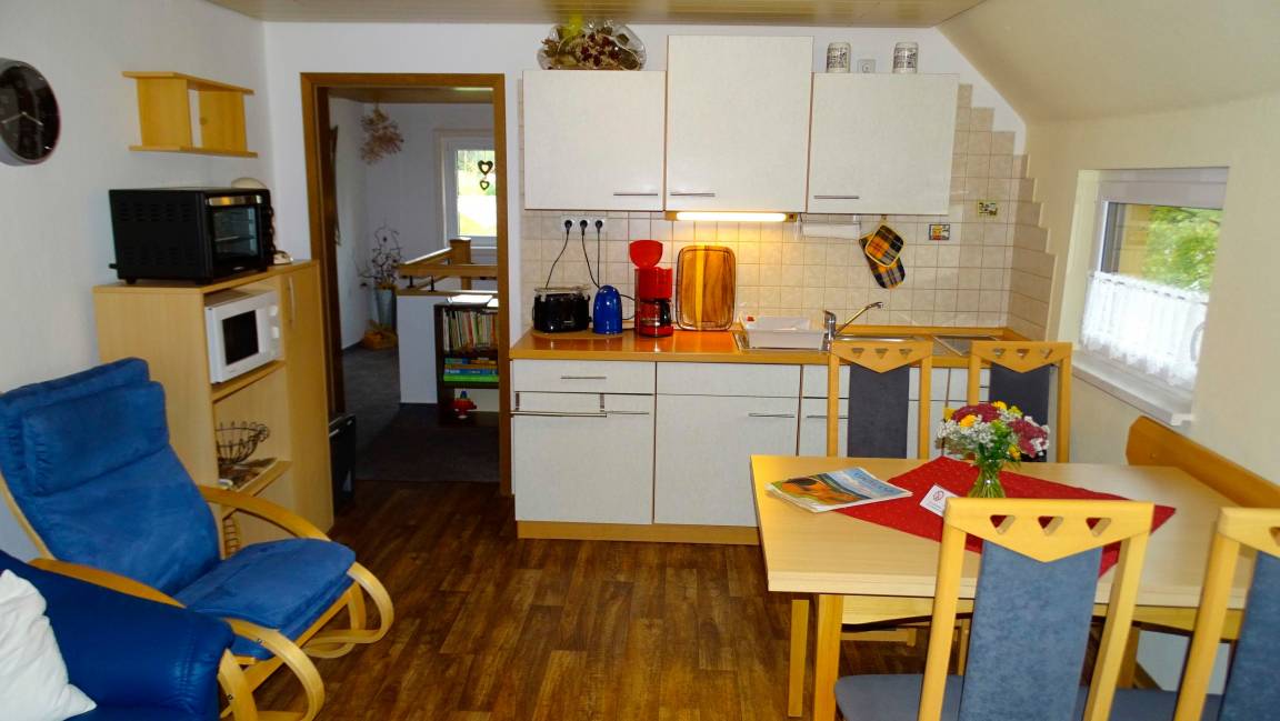 Im Wohnbereich befindet sich die gut ausgestattet Küche mit Kühlschrank (Gefrierfach), Cerankochfeld Minibackofen, Mikrowelle, Kaffeemaschine, Toaster und Wasserkocher.