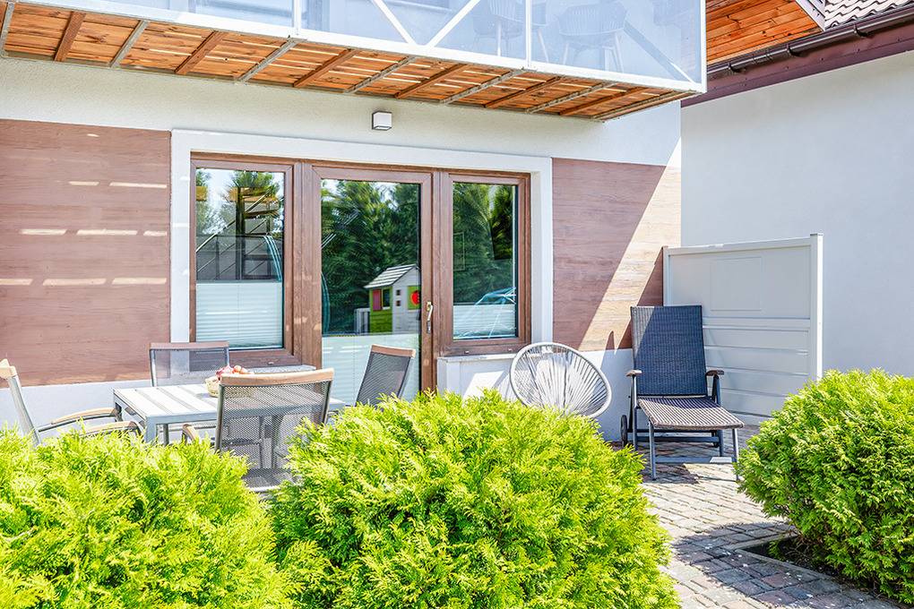 Haus: Schöne, komfortable Doppelhaushälfte mit moderner Einrichtung. 3 Doppelzimmer, 2 Bäder. Kostenloses Internet über WiFi. Zentralheizung. Terrasse mit Sitzmöbeln. In der Anlage: separates Saunahäuschen und Hot Tub . Kinderspielplatz mit Trampolin, Schaukel, Rutsche, Sandkasten zur gemeinschaftlichen Nutzung. 1 Pkw-Stellplatz.