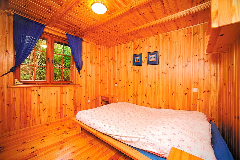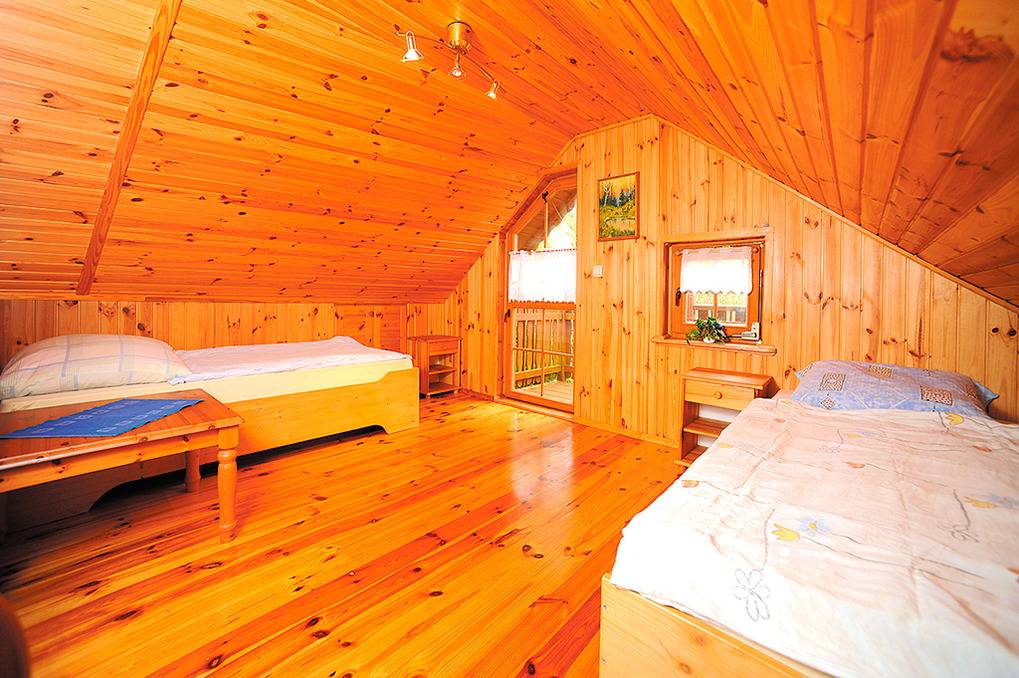 PL 41.11 Ferienhaus 2-6 Pers.: 3-Zimmerhaus mit ca. 50 qm Wohnfläche über 2 Etagen. Parterre: Wohn-/Essraum mit Eckcouch (Ausziehsofa 2 Pers.), Sat-TV, Esstisch. Offene, kleine Küche (Backofen). Doppelzimmer. Bad/WC. Vom Wohnraum Holztreppe ins Dachgeschoss: offenes 2-Bettzimmer mit Balkon.