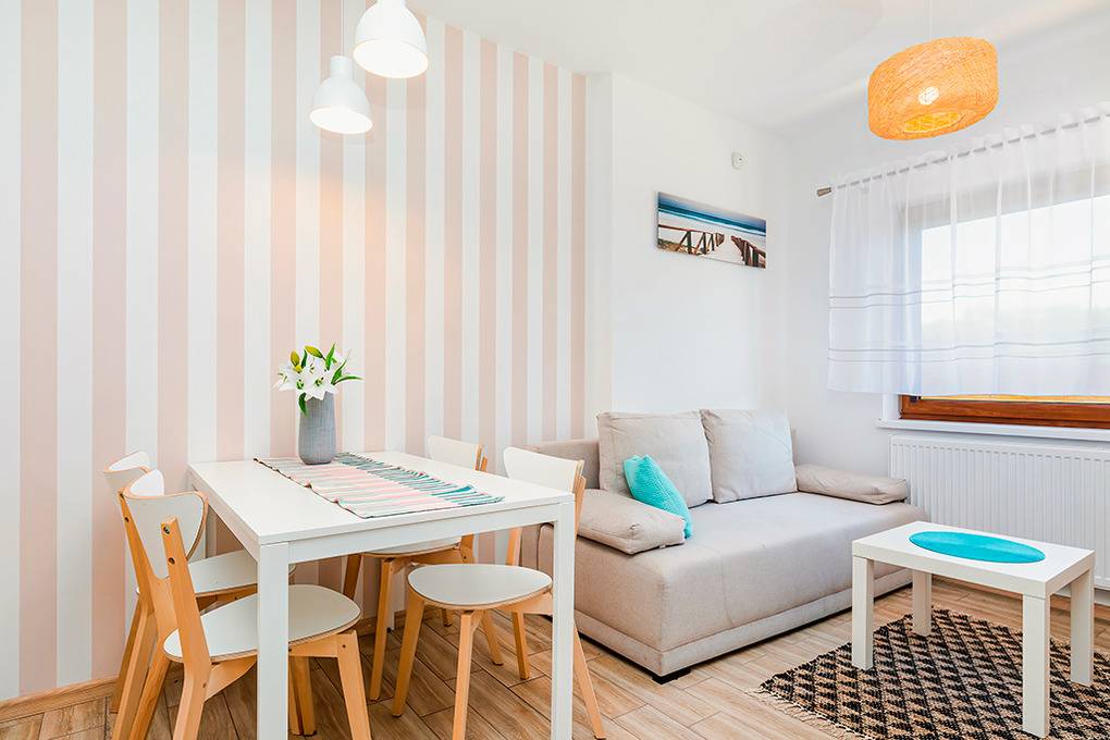Nebenkosten Kurtaxe. Bettwäsche vorhanden. Handtücher mitzubringen. Zusätzliche Leistungen Kostenloser Internetzugang über W-Lan. 1 Pkw-Stellplatz 20 Zl./Tag nur im Zeitraum 01.07.26 - 31.08.26, außerhalb des Zeitraumes inklusive im Preis. Kaution 100 €. Kinder Babybett/Hochstuhl nur innerhalb der maximalen Personenzahl, jeweils ohne Berechnung (Bestellung). Haustier 60 Zl./Aufenthalt, max. 1 Hund (Anmeldung).Räume & Aufteilung