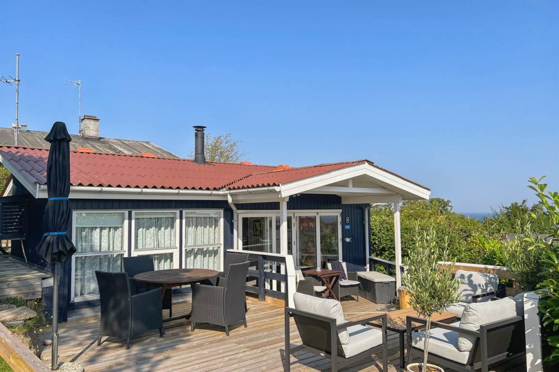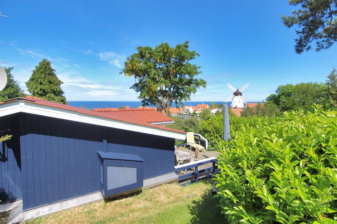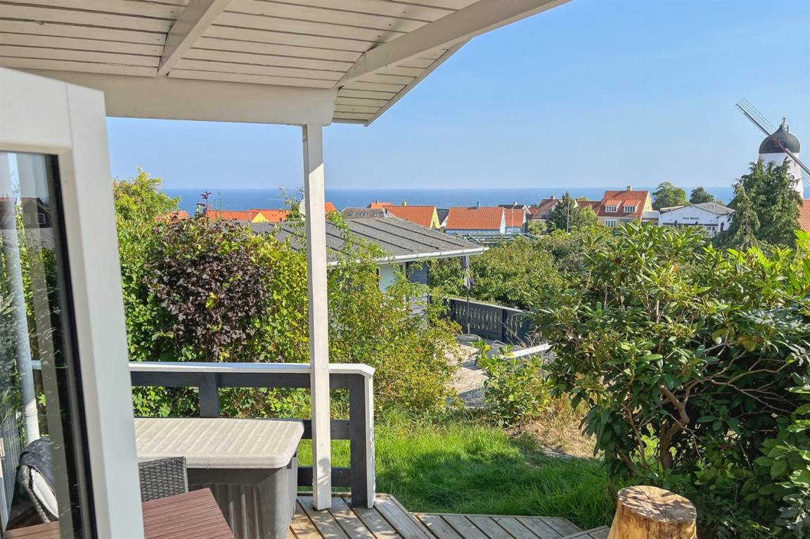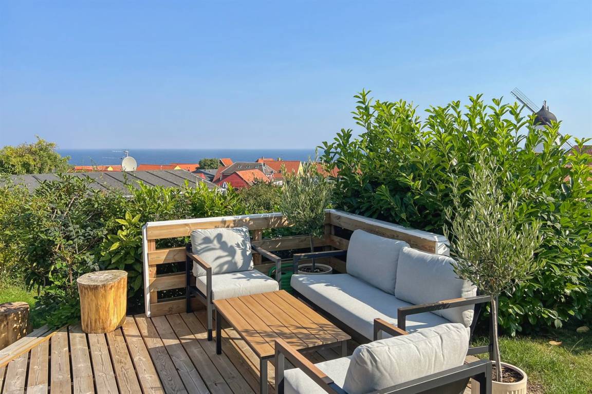 Das Haus hat eine Wohnfläche von 58 m² und bietet den schönsten Panoramablick über die Stadt Gudhjem und die Ostsee an. Außerdem wurde das Haus, das 1997 gebaut wurde, mehrfach modernisiert – zuletzt mit einer neuen Terrasse, die sich auf mehrere Ebenen verteilt. Hier kann man die Morgensonne auf der Aussichts-Terrasse und die Nachmittagssonne, in Ruhe und vor dem Wind geschützt, auf der Terrasse hinter dem Haus genießen. Neue Loungemöbel wurden 2024 aufgestellt.