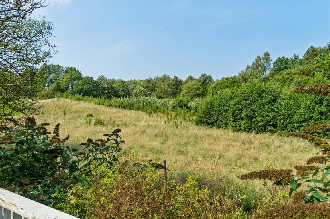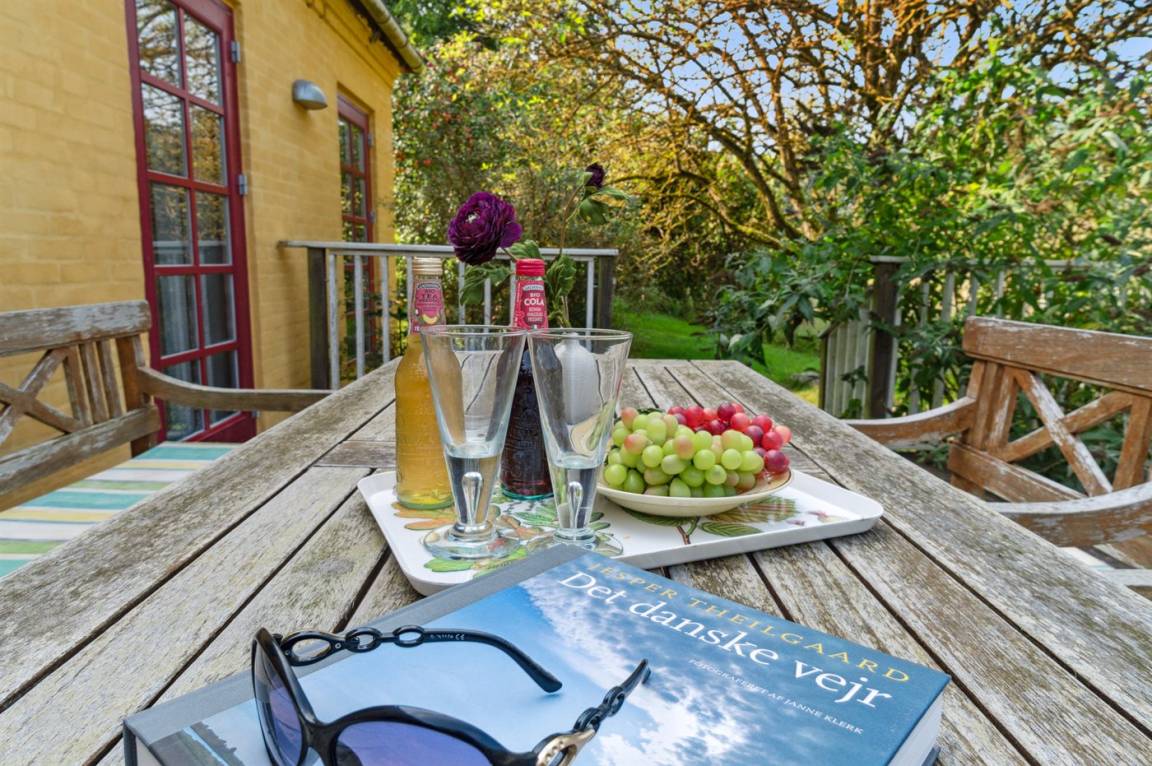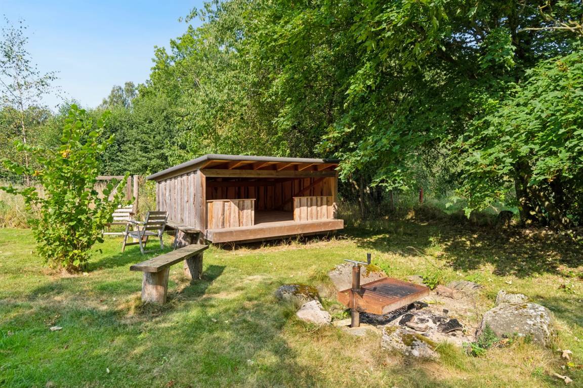 Du kannst die erhöhte Holzterrasse nutzen, von der aus du beim Kaffeetrinken oder Abendessen den schönen Blick auf die Natur genießen kannst. Zum Schutz der Apfelbäume auf dem Grundstück ist der Garten mit einem Damwildzaun eingezäunt.