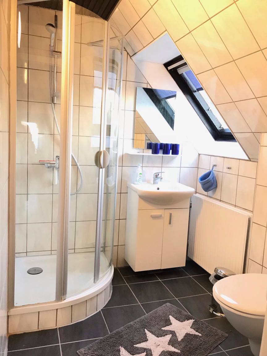 Die Ferienwohnung "Gudhjem" befindet sich im Dachgeschoss, verfügt über einen eigenen Eingang und ist über eine Treppe zugänglich.