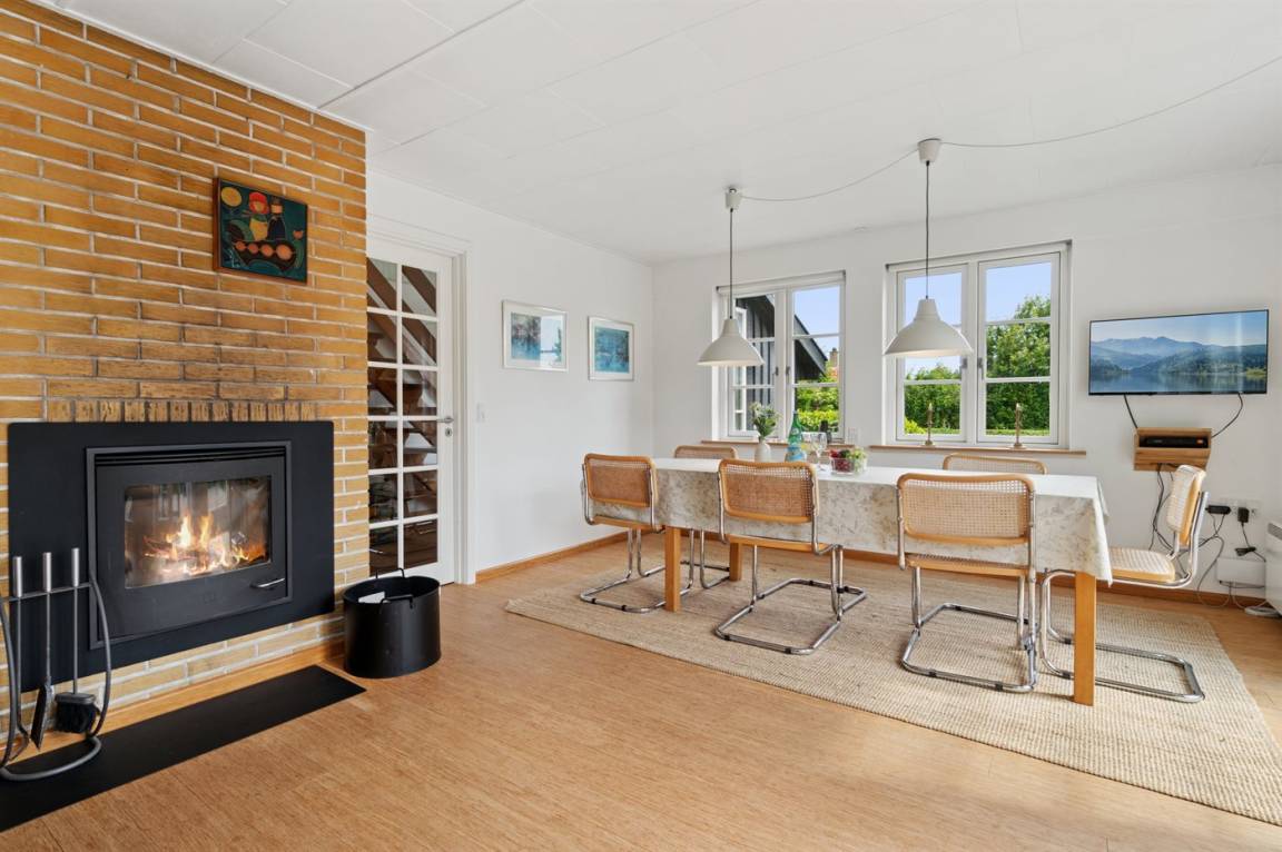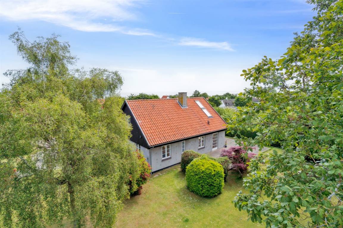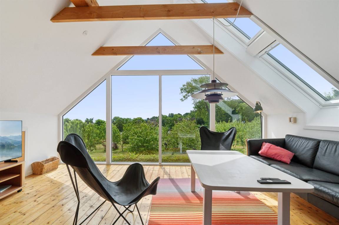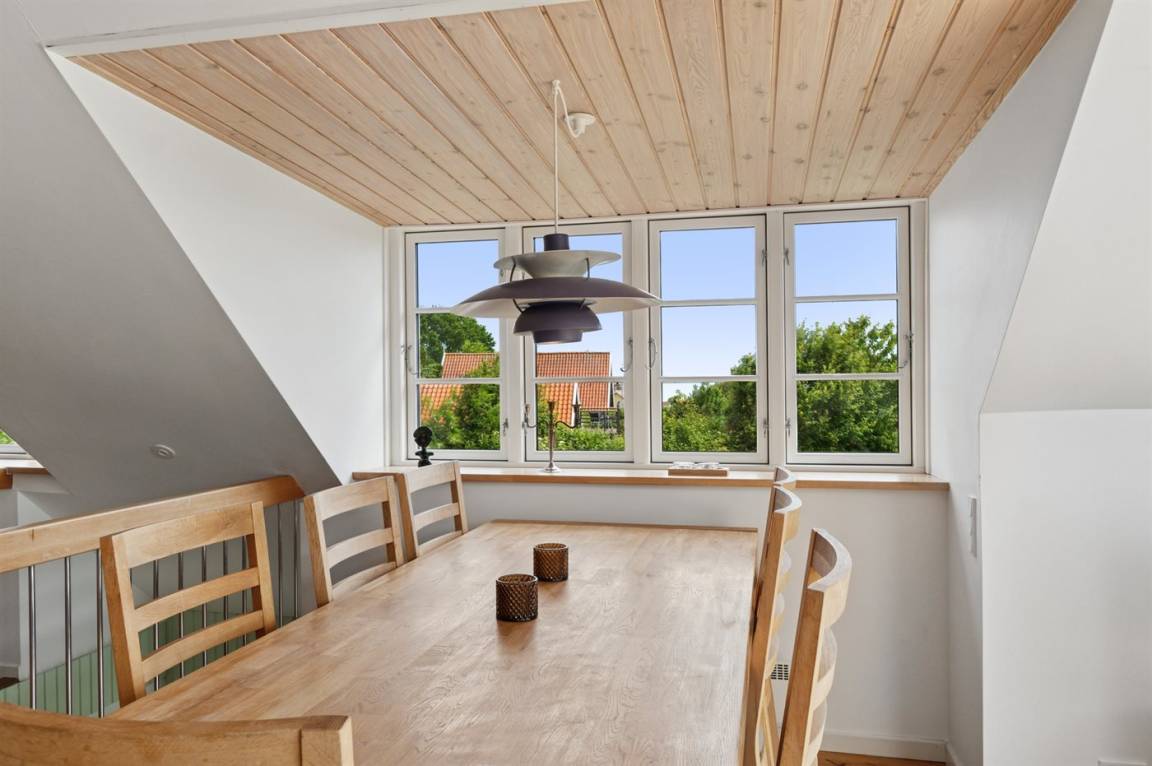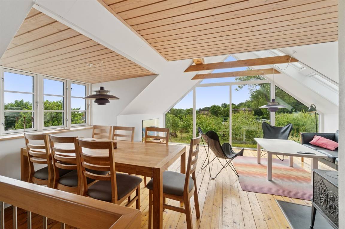 Das Haus ist in zwei Etagen gebaut, mit einem schönen Aussichtszimmer im Obergeschoss und einem großen Panoramafenster in Richtung Küste und der Landschaft südlich von Melsted und Gudhjem. Hier hast du die Möglichkeit, den Lauf der Sonne am Himmel zu verfolgen.