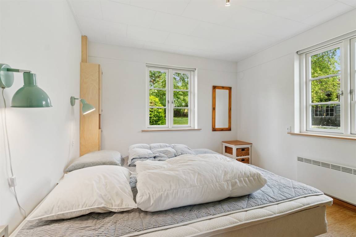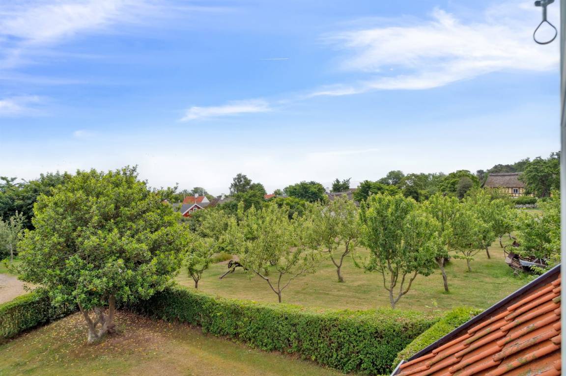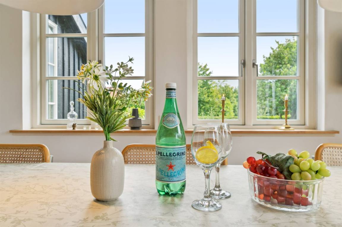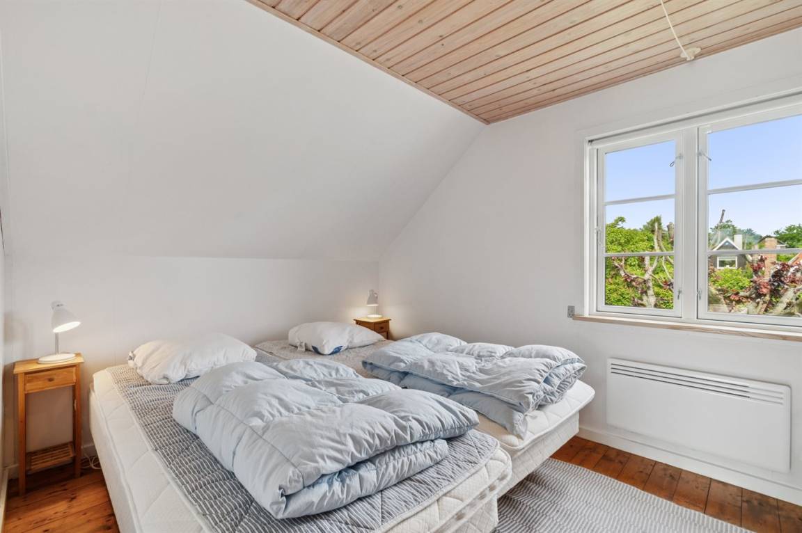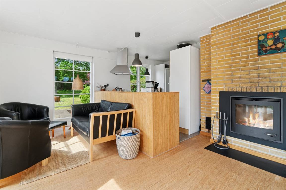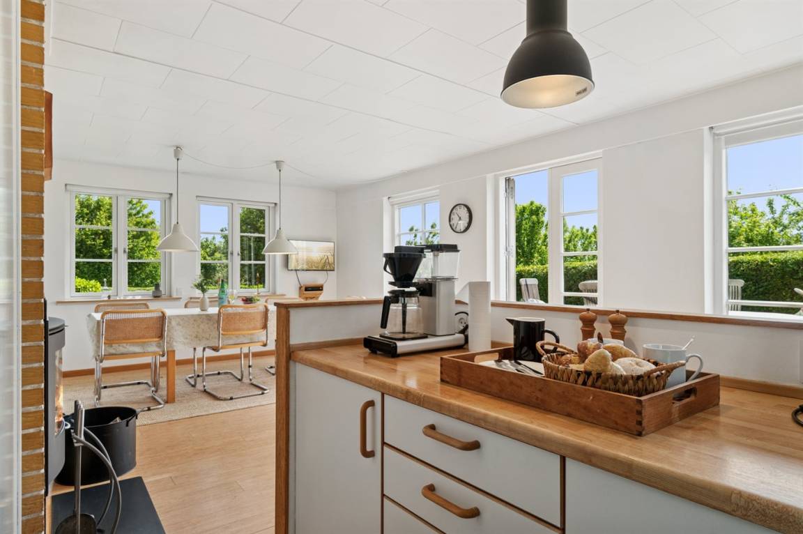 Das Haus ist in zwei Etagen gebaut, mit einem schönen Aussichtszimmer im Obergeschoss und einem großen Panoramafenster in Richtung Küste und der Landschaft südlich von Melsted und Gudhjem. Hier hast du die Möglichkeit, den Lauf der Sonne am Himmel zu verfolgen.