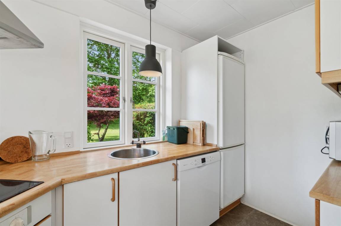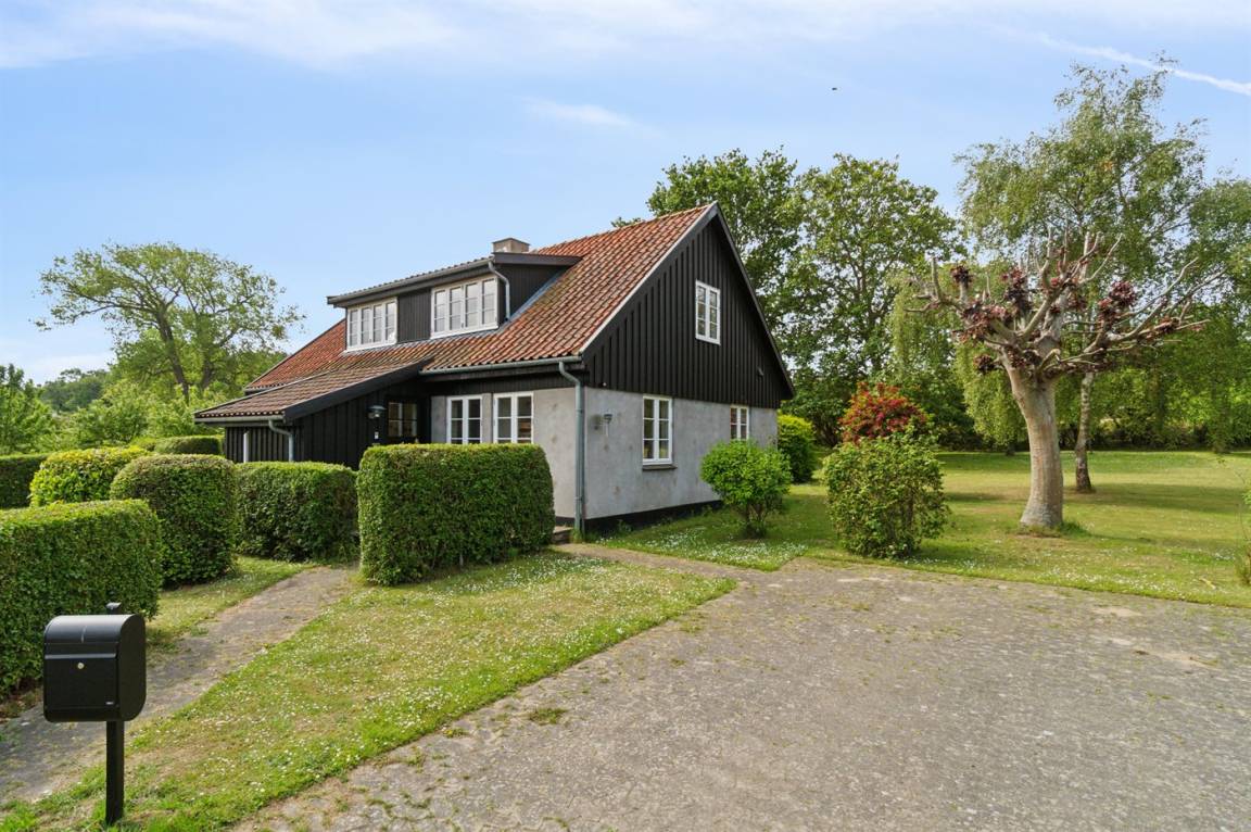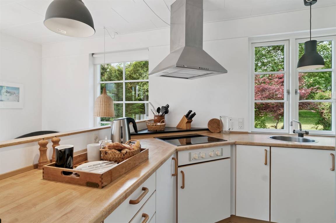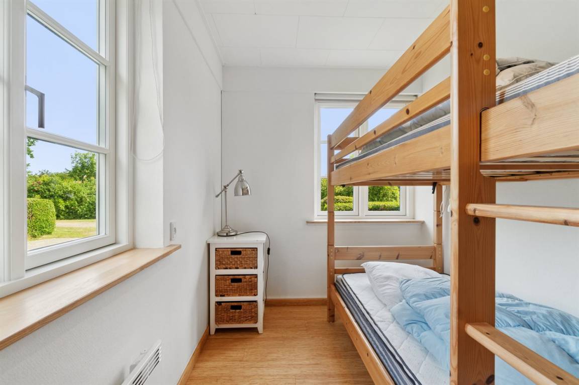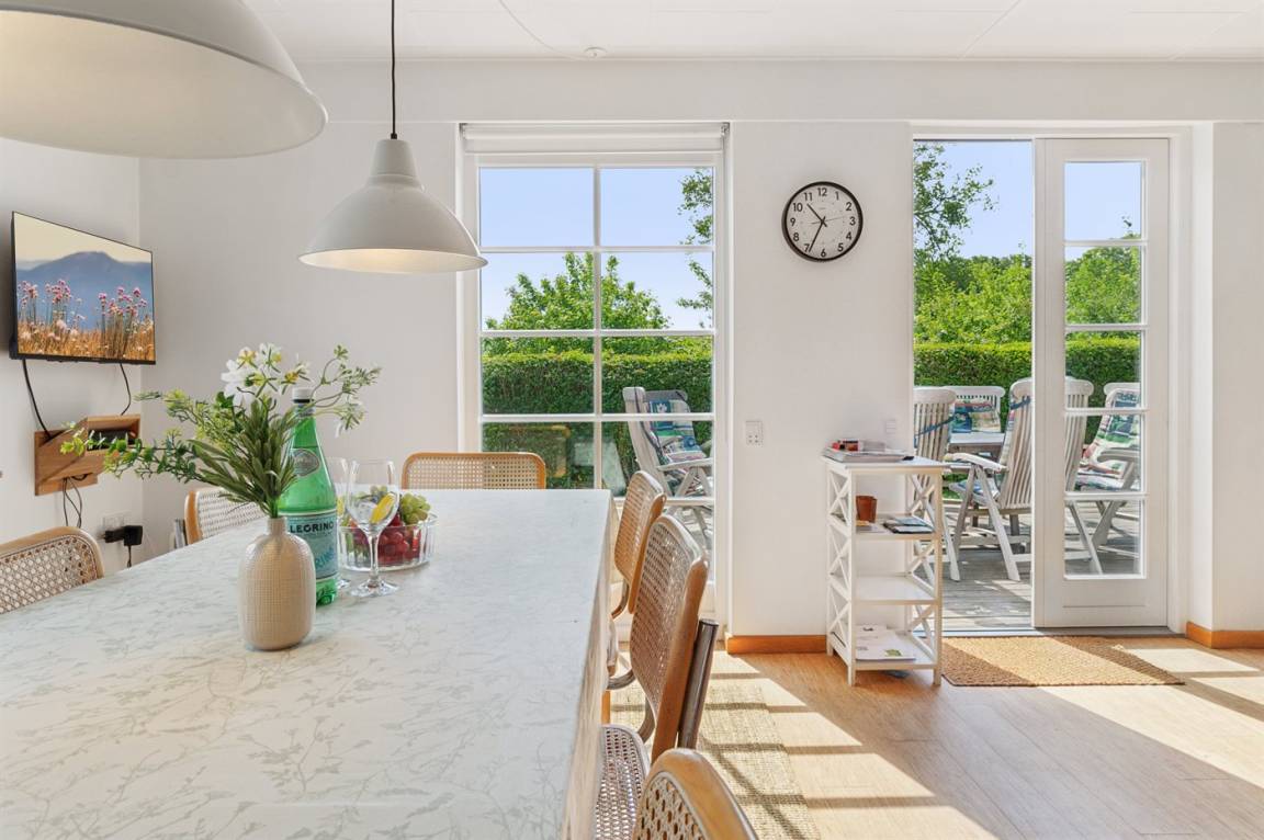 Das Haus ist in zwei Etagen gebaut, mit einem schönen Aussichtszimmer im Obergeschoss und einem großen Panoramafenster in Richtung Küste und der Landschaft südlich von Melsted und Gudhjem. Hier hast du die Möglichkeit, den Lauf der Sonne am Himmel zu verfolgen.